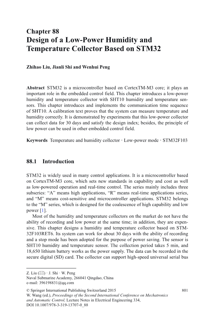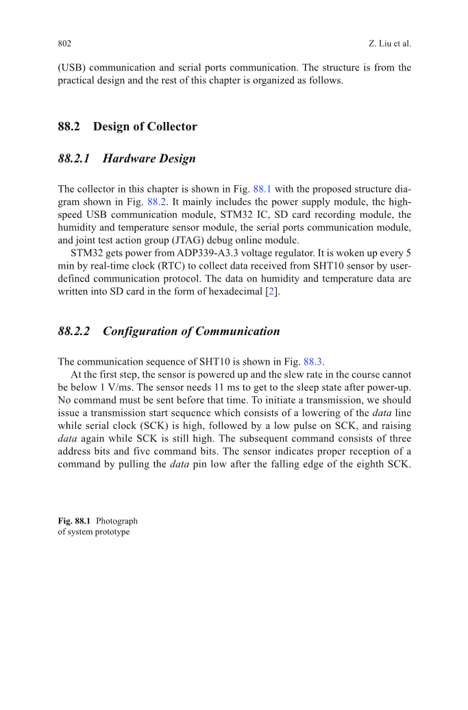 本章的数据收集器如图88.1,所提出的结构图如图88.2。它主要包括电源模块,高速USB通信模块,STM32 IC,SD卡录音模块,湿度和温度传感器模块,串行端口通信模块,和联合测试(JTAG)在线调试模块。STM32从ADP339-A3.3稳压器取电。每5分钟由实时时钟(RTC)可以唤醒它,这样用户可以收集从SHT10传感器接收到的数据定义的通信协议。湿度和温度数据的数据是写入到SD卡中的十六进制的形式。