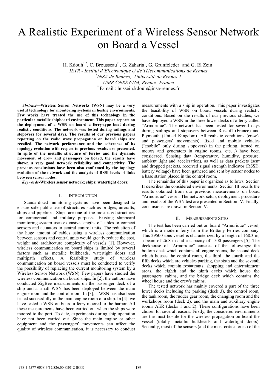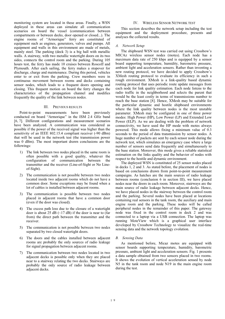 在[3]中,一个传感器网络在船舶的主引擎舱中测试成功。在[4]中,我们测试了WSN在一艘停泊在港口的船舶上的运行。所有这些测量都是在船泊靠在港口的情况下进行的。到目前为止,还没在船舶运行过程中进行测量。由于主机或其他设备和乘客的运动可以影响无线通信质量,有必要测量船在运行过程中的情况。本文调查了船上的WSN在现实条件下的可行性。基于之前的研究结果,我们在“Armorique”船上三个较低的甲板部署了一个传感器网络。船舶在罗斯科夫(法国)和普利茅斯(英国)航行已经停留的过程中我们对无线网络传感器进行了测试。所有现实条件(船员和乘客的运动),固定和移动车辆(只在中转,“移动”)停车,打开汽车在发动机和发电机的房间,等hellip;)。遥感数据(温度、湿度、压力、环境光和加速度),以及数据包(传输数据包,发送和接收信号强度指示(RSSI),电池电压)已经被传感器节点收集和发送到放在控制室的基站。