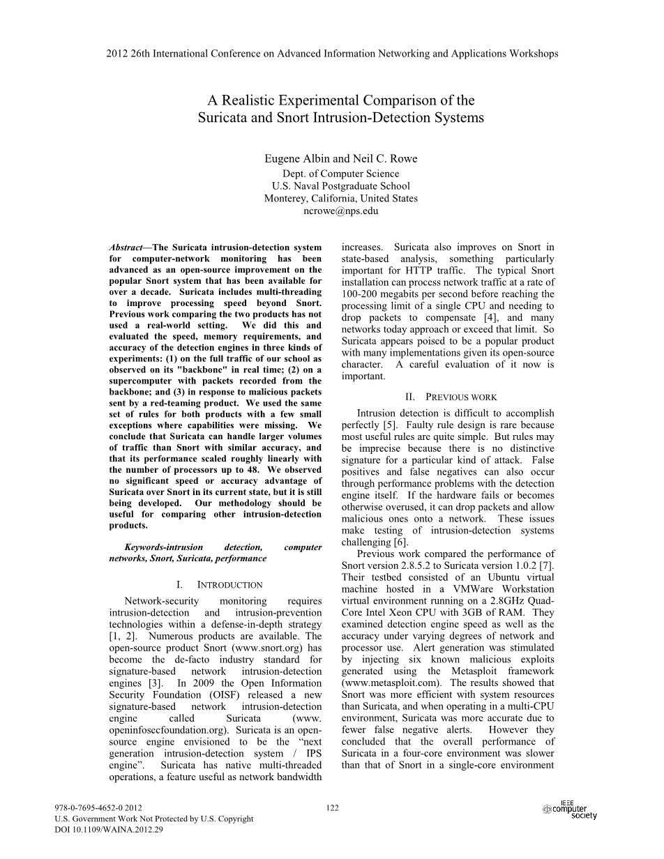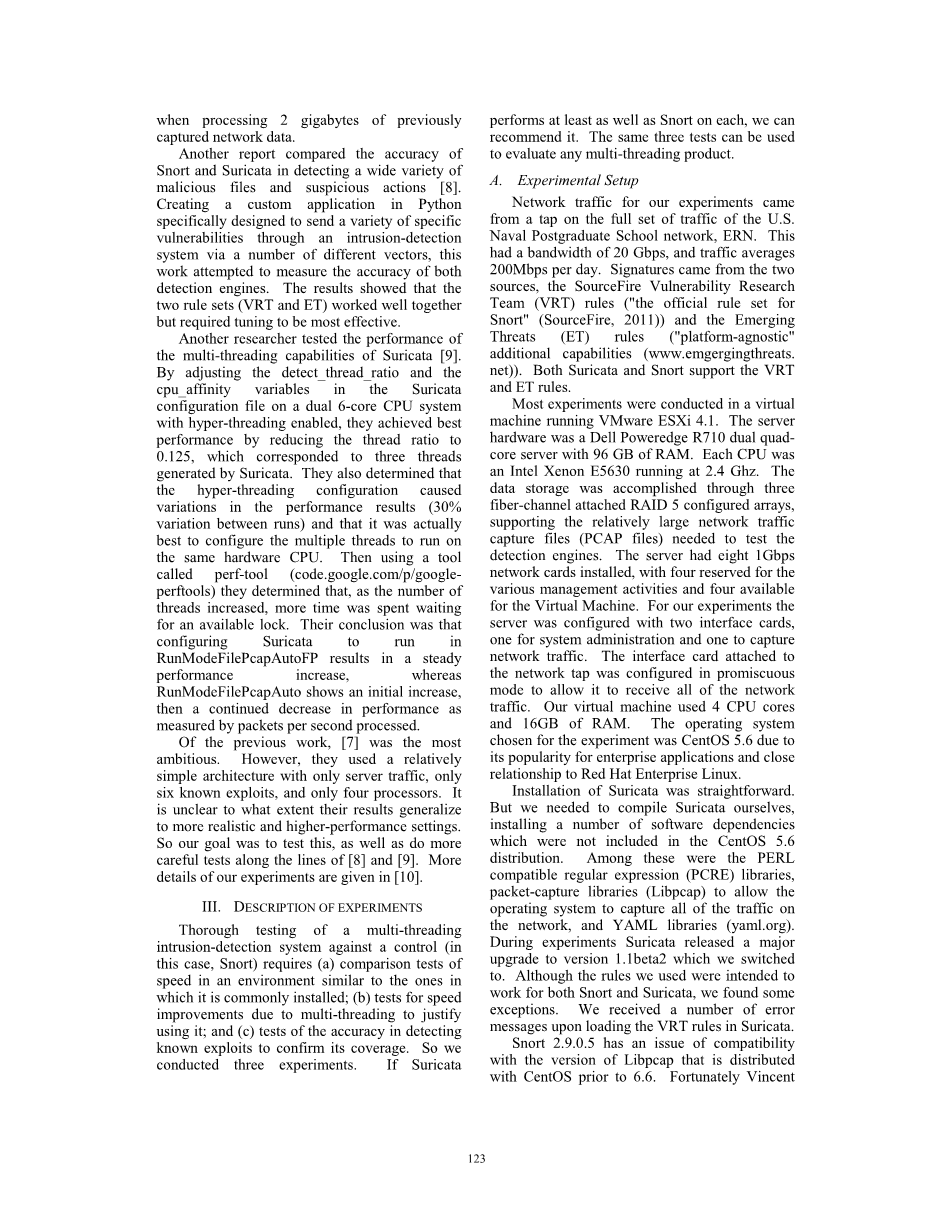 之前的工作对比了Snort2.8.5.2和Suricata1.0.2[7]之间的性能差异。他们的测试包括一个2.8GHz 四核intel CPU,3GB内存的机子上的VMWARE Workstation上搭建的ubuntu虚拟机虚拟环境。他们测试了在不同的网络及处理器层次下入侵检测引擎的速度和精准度。报警触发用注入六个由Metasploit(www.metasploit.com)框架开发的已知的恶意文件来模拟的,结果表明了Snort会比Suricata更有效的利用系统资源,当涉及到多核环境时,Suricata则因为有更少的错误警报而显得更加精准。然而他们得出了一个结论:当处理2GB的网络数据包时,在四核环境下的Suricata比在单核环境下的Snort的处理速度更慢。
