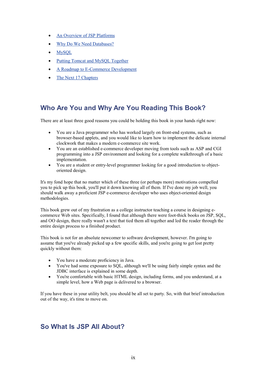 我希望无论是这三个(或更多)动机中的哪一个迫使你拿起这本书,当你完全明白的时候你就不会需要这些书了。如果我把我的工作做好,你也应该成为一个使用面向对象设计方法的精通JSP电子商务的高效开发人员。
