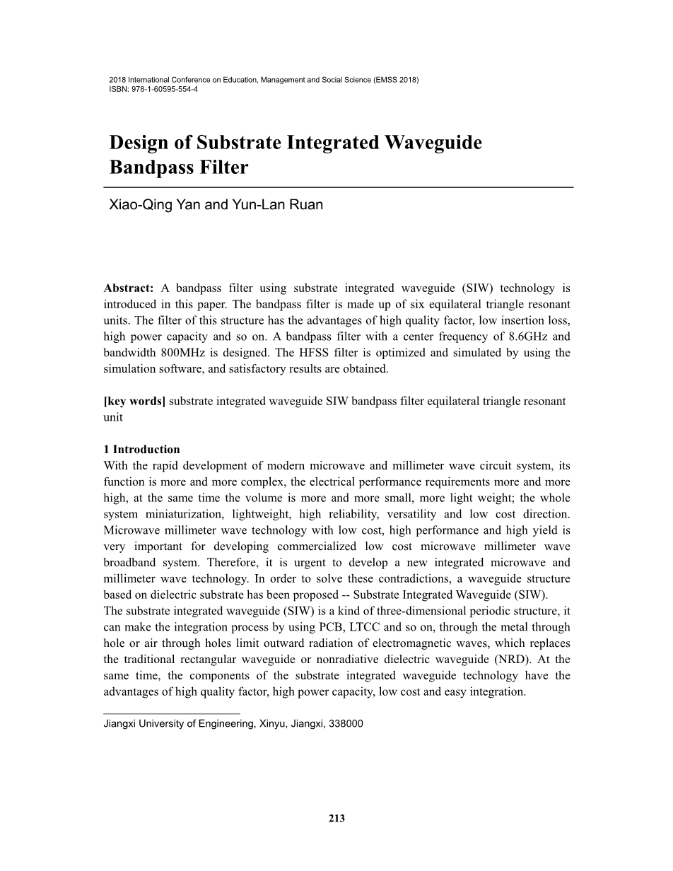 关键词:基片集成波导 SIW带通滤波器 等边三角形谐振单元