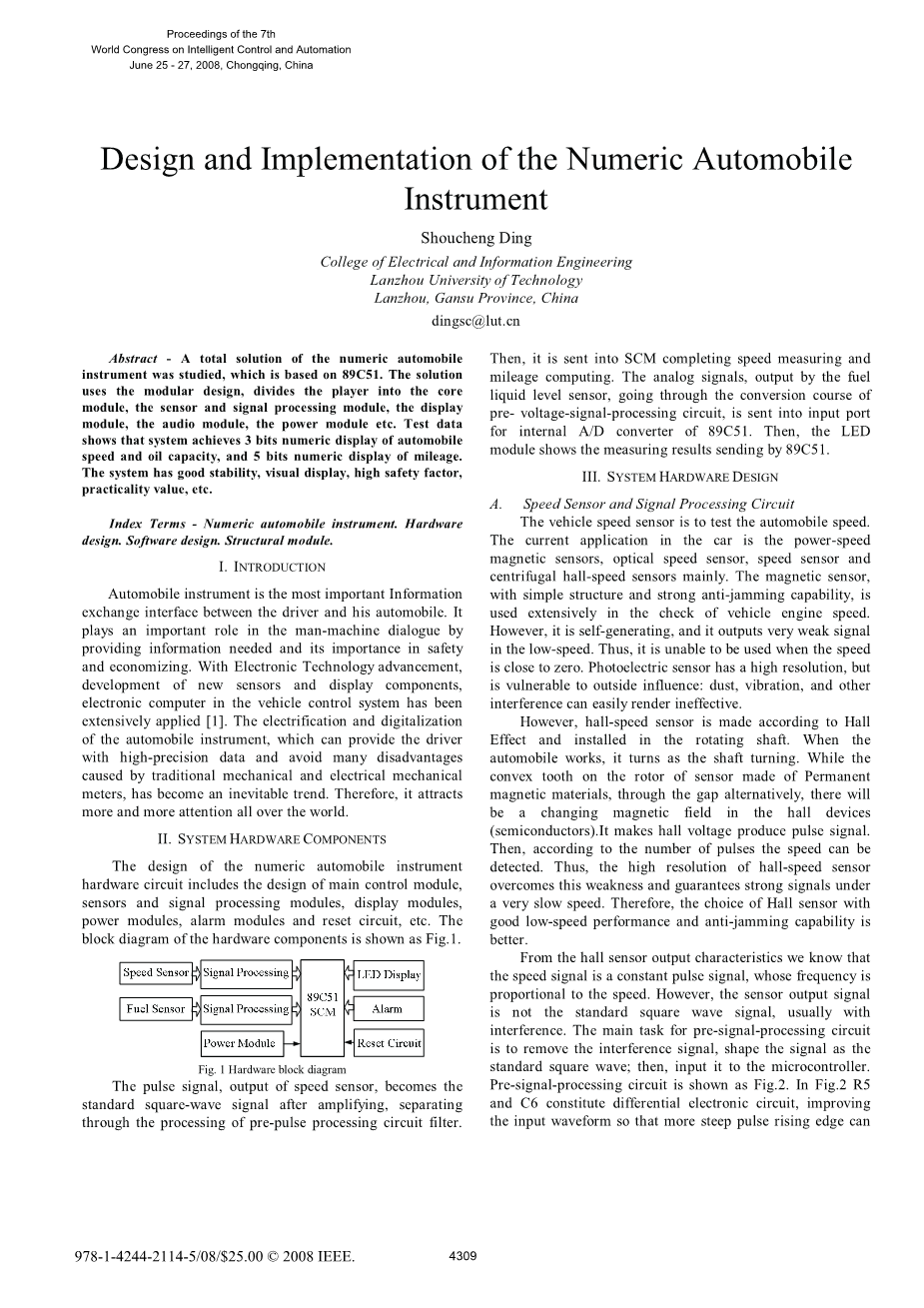 摘要 - 研究了基于89C51的数字汽车仪表总体解决方案。 该解决方案采用模块化设计,将播放器分为核心模块,传感器和信号处理模块,显示模块,音频模块,电源模块等。测试数据表明系统实现了汽车速度和机油的3位数字显示容量和里程的5位数字显示。 该系统具有稳定性好,可视化显示,安全系数高,实用价值高等特点。