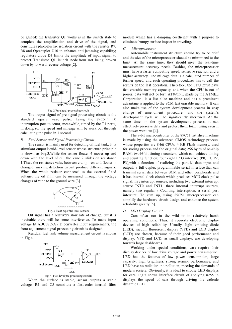 然后,它被发送到SCM完成测速和里程计算。 通过燃料液位传感器输出的模拟信号经过预电压信号处理电路的转换过程被发送到用于89C5l的内部AID转换器的输入端口。 然后,LED模块显示由89C5l发送的测量结果。