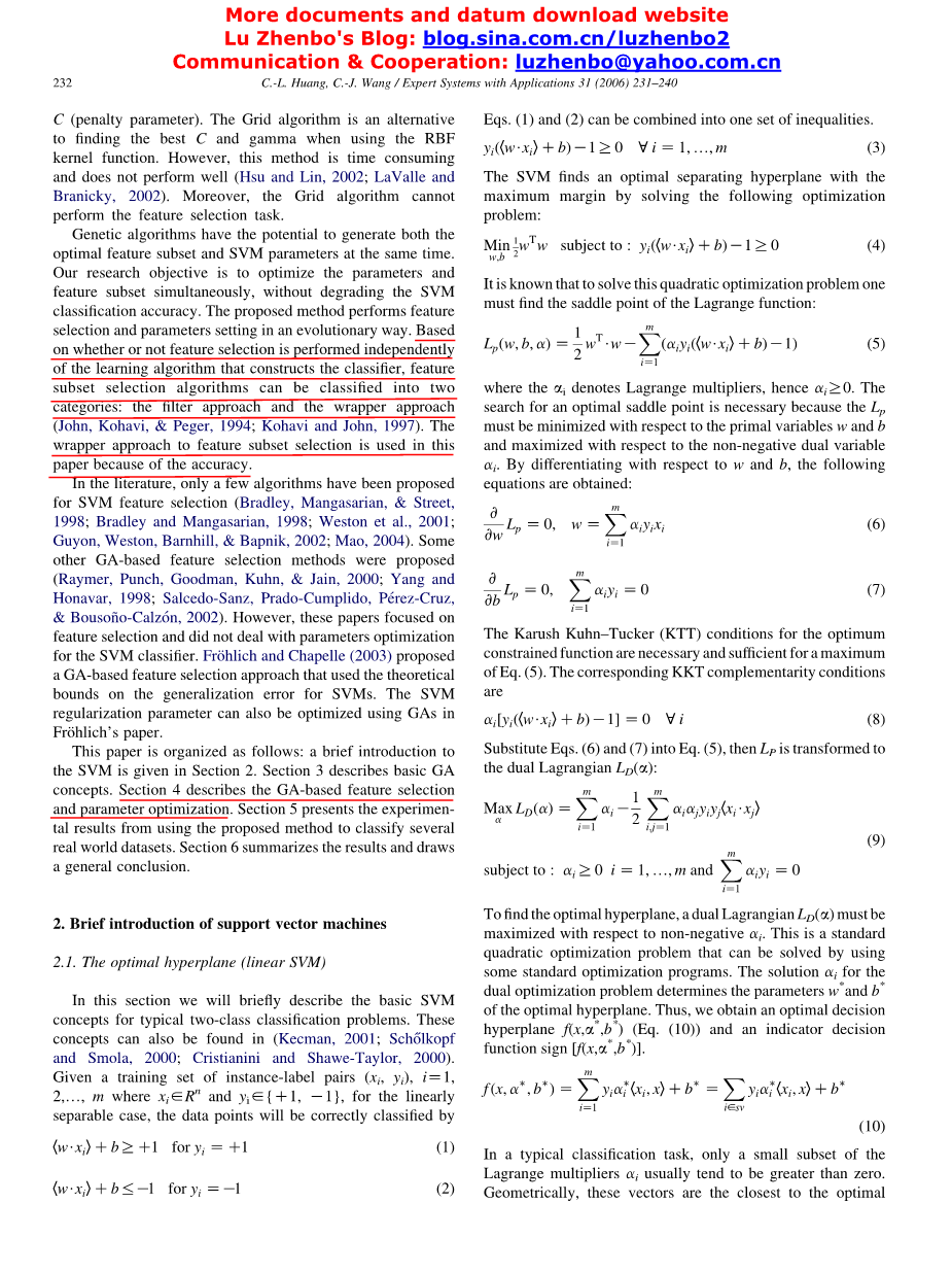 在文献中,只有少数算法被提出用于SVM特征选择(Bradley,Mangasarian,&Street,1998; Bradley和Mangasarian,1998; Weston等人,2001; Guyon,Weston,Barnhill,&Bapnik,2002; Mao ,2004)。 (Raymer,Punch,Goodman,Kuhn和Jain,2000; Yang和Honavar,1998; Salcedo-Sanz,Prado-Cumplido,Perez-Cruz和Bouson-o-Calzo n,2002)。 然而,这些论文集中在特征选择上,并没有涉及SVM分类器的参数优化。 Frohhlich和Chapelle(2003)提出了一种基于遗传算法的特征选择方法,该方法利用了SVMs泛化误差的理论界限。 SVM正则化参数也可以使用Gro在Frohhlich的论文中进行优化。