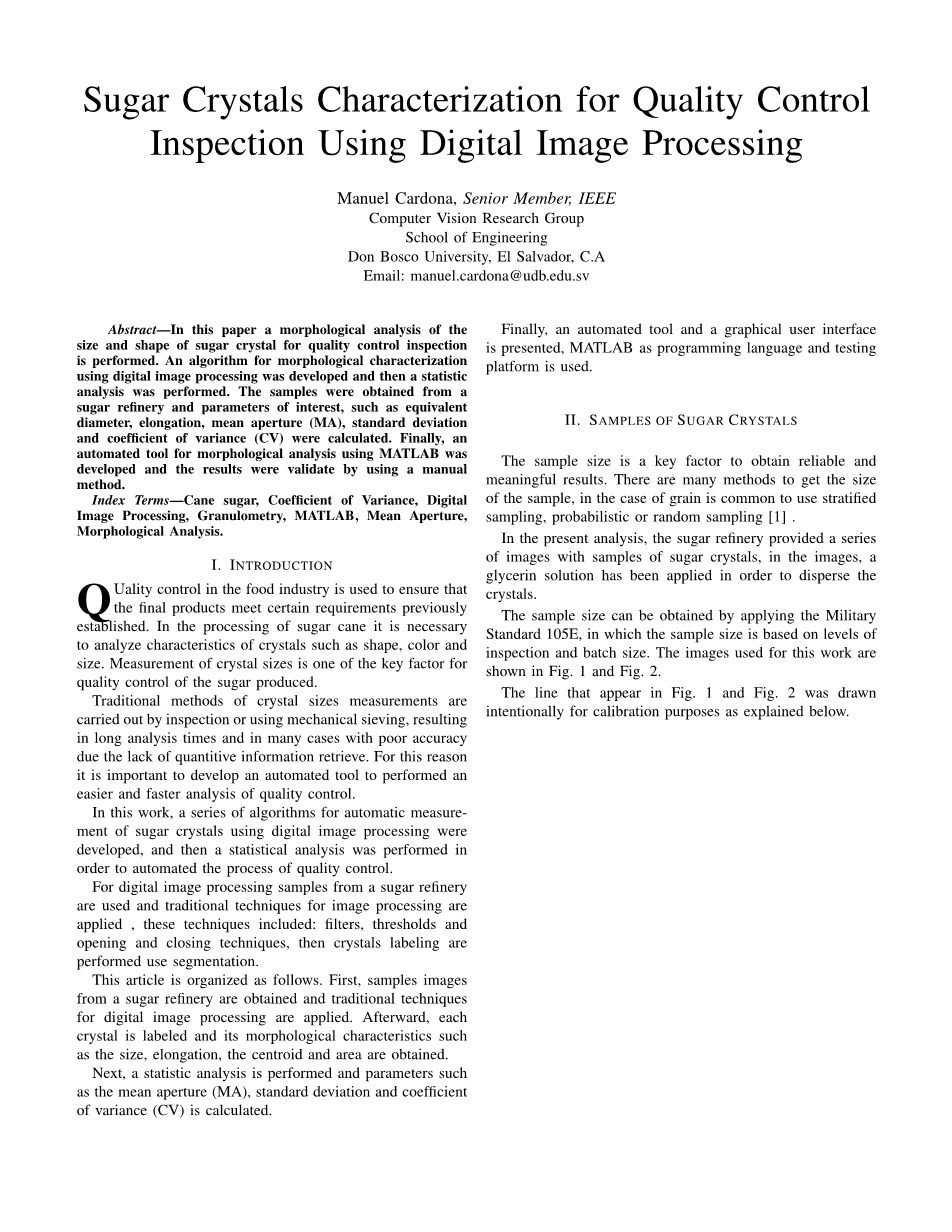 对于数字图像处理,使用糖厂的样品,并采用传统的图像处理技术,这些技术包括:过滤器,阈值和开启和关闭技术,然后使用分割进行晶体标记。