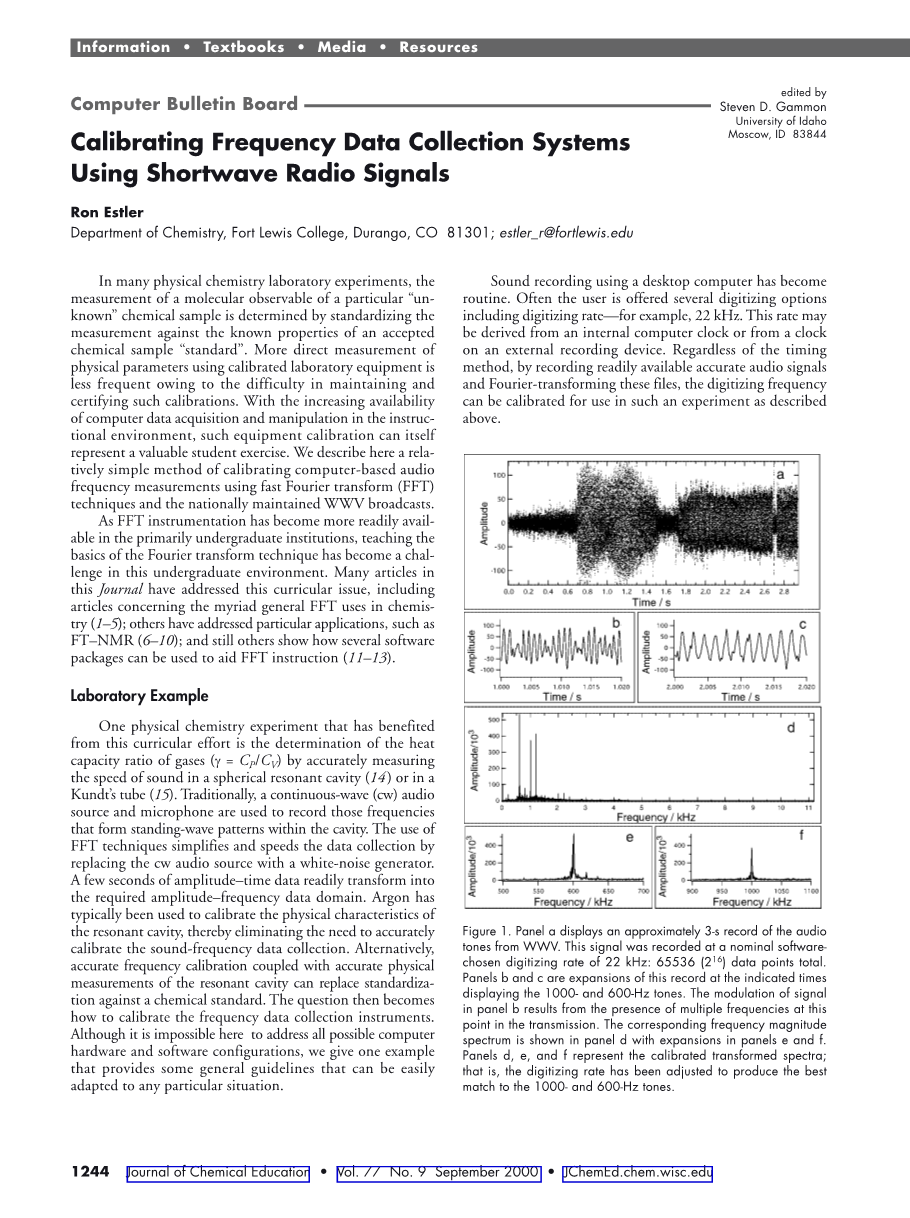 在许多物理化学实验室实验中,对特定“未知”化学样品的分子观察结果的测量通过将测量结果与已接受的化学样品“标准”的已知特性标准化来确定。 由于难以维护和认证这些校准,因此使用校准的实验室设备更直接地测量物理参数的频率较低。 随着计算机数据采集和操作在教学环境中的越来越多的可用性,这种设备校准本身就代表了宝贵的学生练习。 我们在这里描述一种使用快速傅立叶变换(FFT)技术和国家维护的WWV广播来校准基于计算机的音频频率测量的相对简单的方法。 随着FFT仪器的使用变得更加容易 -