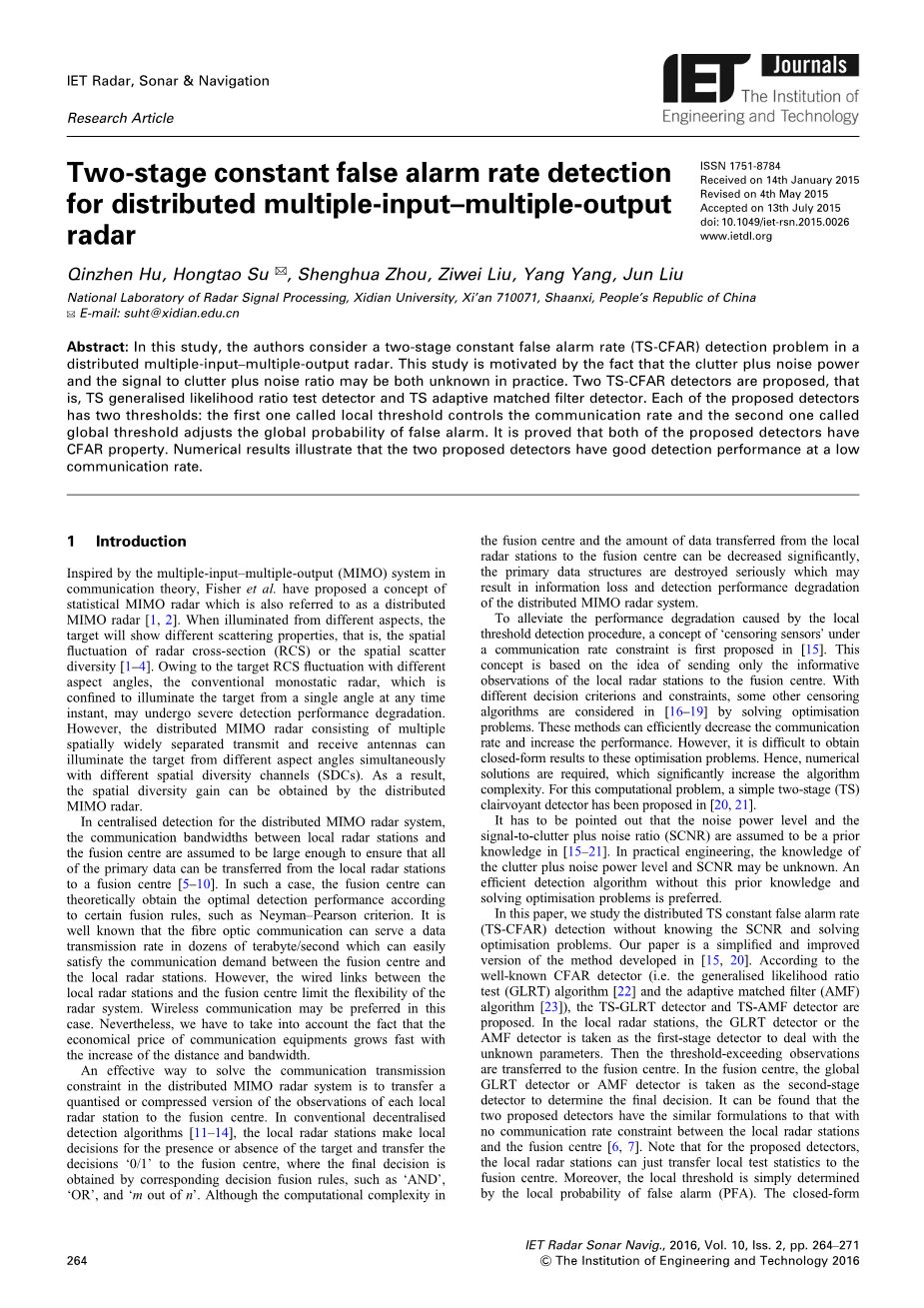 分布式多输入多输出雷达的两级恒虚警率检测外文翻译资料