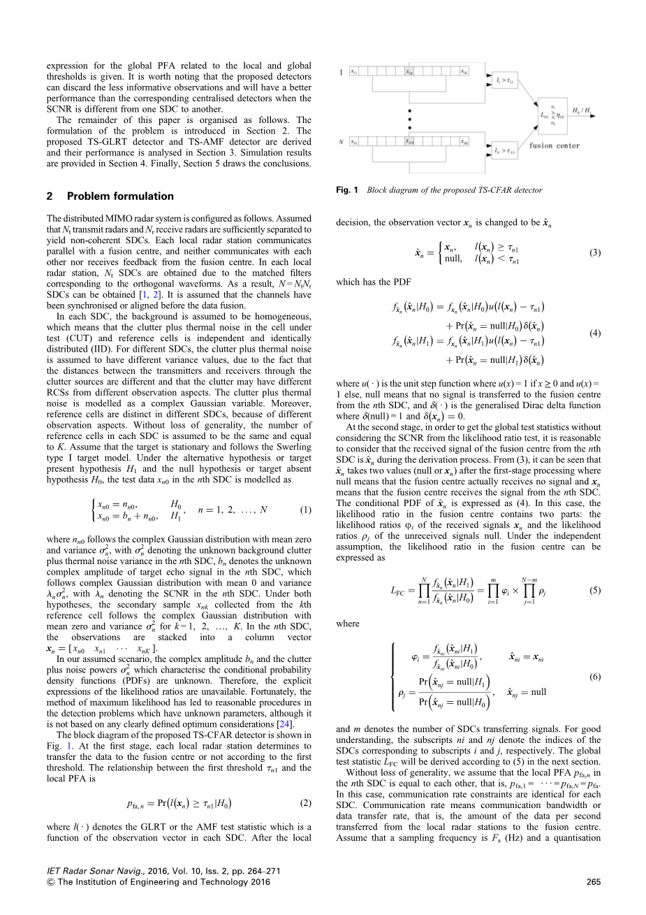 所提出的TS-CFAR检测器的框图如图1所示。在第一阶段,每个本地雷达站根据第一阈值确定是否将数据传输到融合中心。 第一阈值tn1和当地PFA之间的关系是
