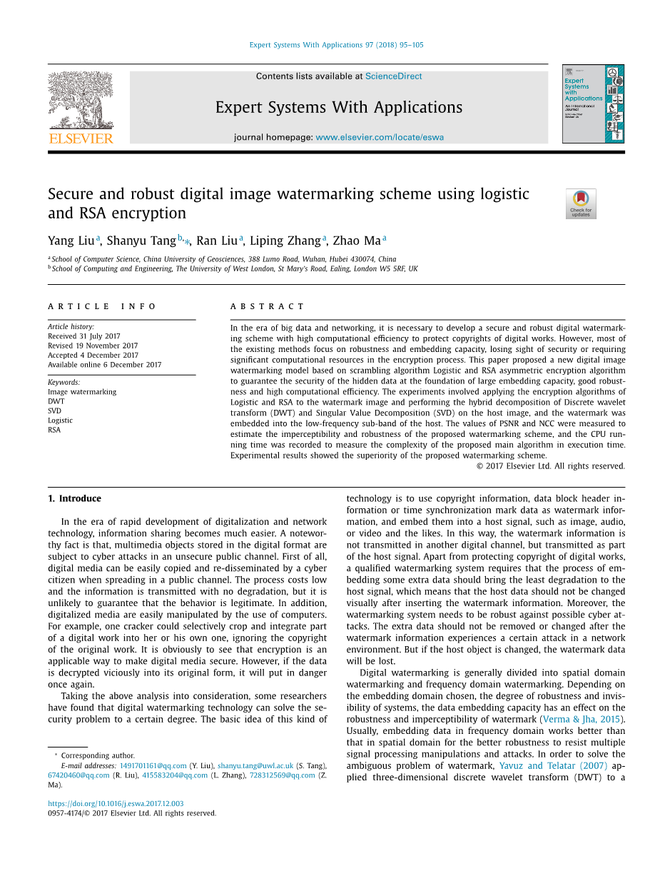 摘要:在大数据和网络时代,有必要开发一种具有高计算效率的安全和可靠的数字水印方案来保护数字作品的版权。然而,现有的大多数方法都集中在鲁棒性和嵌入能力上,在加密过程中忽视安全性或需要显着的计算资源。 本文提出了一种基于置乱算法Logistic和RSA非对称加密算法的数字图像水印模型,在大嵌入能力的基础上保证隐藏数据的安全性,鲁棒性好,计算效率高。 实验包括将Logistic和RSA加密算法应用到水印图像中,对主图像进行离散小波变换(DWT)和奇异值分解(SVD)混合分解,并将水印嵌入到低频子图中主机的频带。 通过测量PSNR和NCC的值来估计所提出的水印方案的不可感知性和鲁棒性,并且记录CPU运行时间以测量所提出的主算法在执行时间内的复杂度。实验结果表明了所提出的水印方案的优越性。