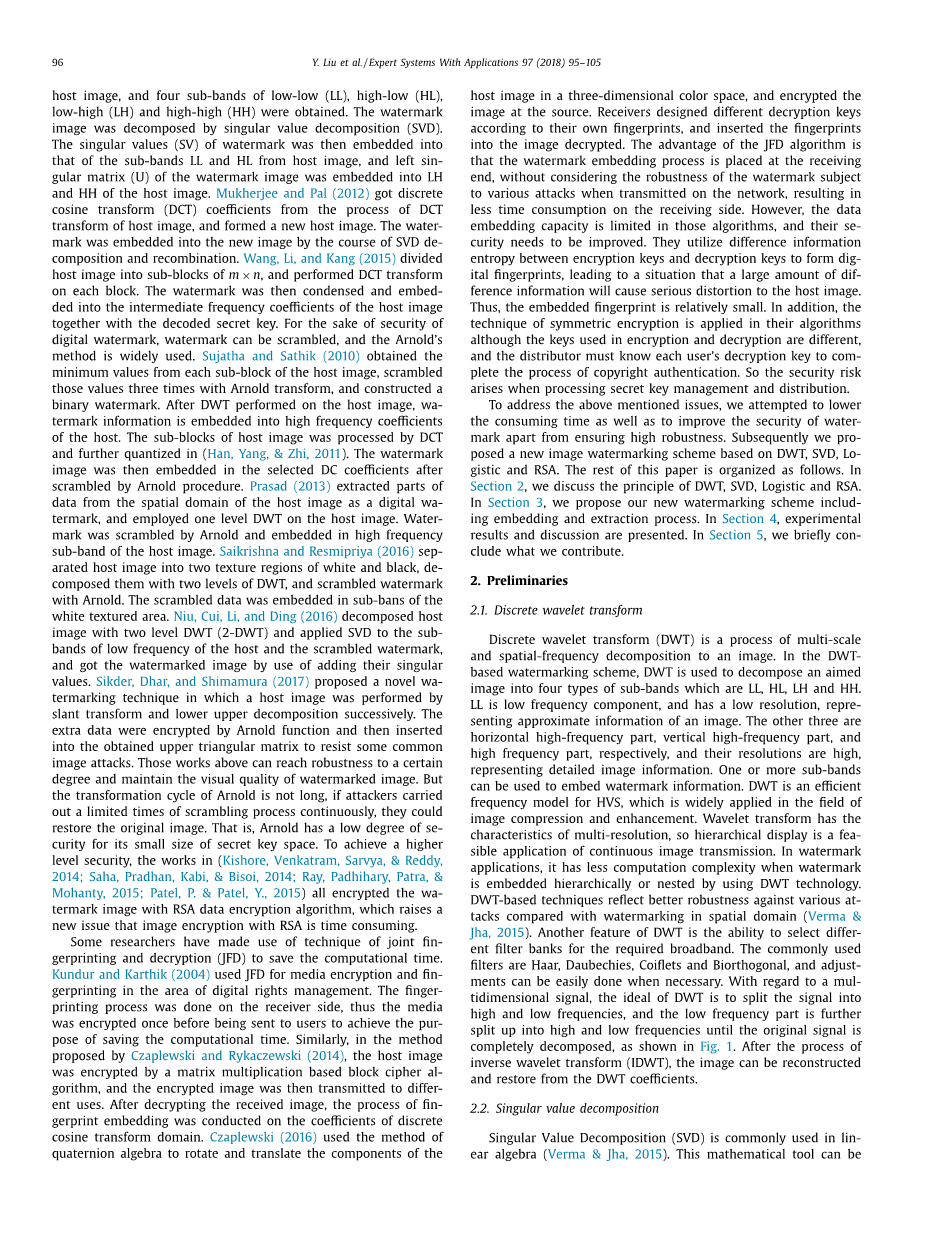 为了解决上述问题,我们试图降低消耗时间以及除了确保高鲁棒性之外还提高水印的安全性。随后我们提出了一种基于DWT,SVD,Logistic和RSA的图像水印算法。本文的其余部分安排如下。在第2节我们讨论了DWT,SVD,Logistic和RSA的原理。在第3节,我们提出了包括嵌入和提取过程的新的水印方案。在第4节,介绍了实验结果和讨论。在第5节,我们简单地总结我们的贡献。