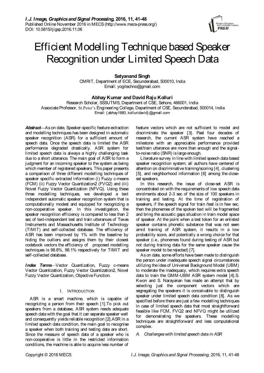 英文题目 Efficient Modelling Technique based Speaker Recognition under Limited Speech Data