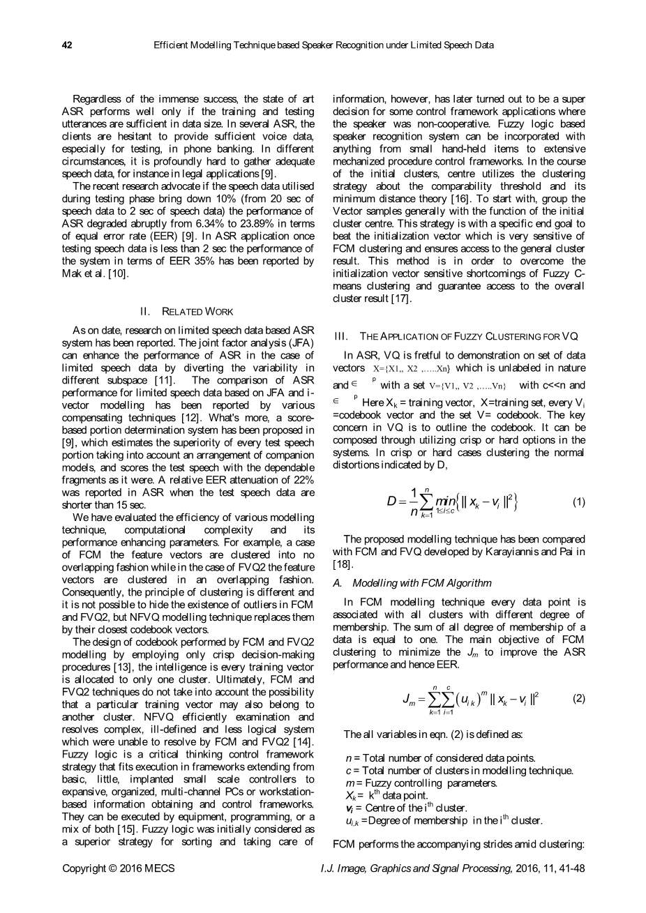 到目前为止,已经做出了一些努力,已利用通用背景模型(UBM)的思想来区分处于不适当语音信号环境下的人以减少不足,这需要额外的语音数据来训练GMM-UBM ASR系统模型[4] .S。 Kwon和S. Narayanan试图通过选择分离说话人的分量矢量,可以在有限的语音数据条件下区分说话人[8]。正如我们之前所指出的那样,在语音数据有限的情况下,只有少数几种建模技术是最直接可行的,如FCM,FVQ2和NFVQ可能用于演示发言者。这些建模技术非常简单,计算复杂度较低。