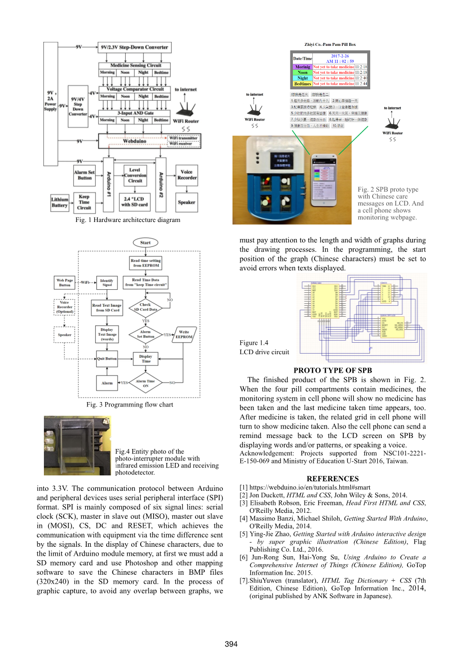 传统的药丸盒设计为一天或一周,用于装载药丸而不掉出容器。电子药丸盒可以通过设置警报提醒用户,但价格远高于传统的药盒。台湾2015人口中,65岁以上人口占总人口的12.51%,迅速的人口老龄化已成为全球的共同趋势,因此有必要提高人们对促进健康和福祉或提高老年人生活质量的认识。问题是如何向那些难以接触到提供者的人提供高质量的护理。最近发展起来的应用是将集成的单个传感器作为传感器网络的一部分,而传感器网络依赖于现代无线通信技术。它们通过将传感器网络的数据传输到个人计算机或移动电话来工作。一种辅助设备,智能药盒(SPB),如旋毛虫、小柱钻、麦迪夫皮尔盒、E-丸多药器这些设备允许老年人的家庭成员知道老人是否服用过药物,以确保有效的健康维护。有一些智能药盒只是提醒或监控设备,老人和他/她的家人之间没有任何互动。我们的交互式SPBB不仅检测(转发到网页)老年人在服药,而且还通过显示单词和/或模式,或说话来接收提醒信息,传送到SPB上的LCD上且向用户发出声音提醒。
