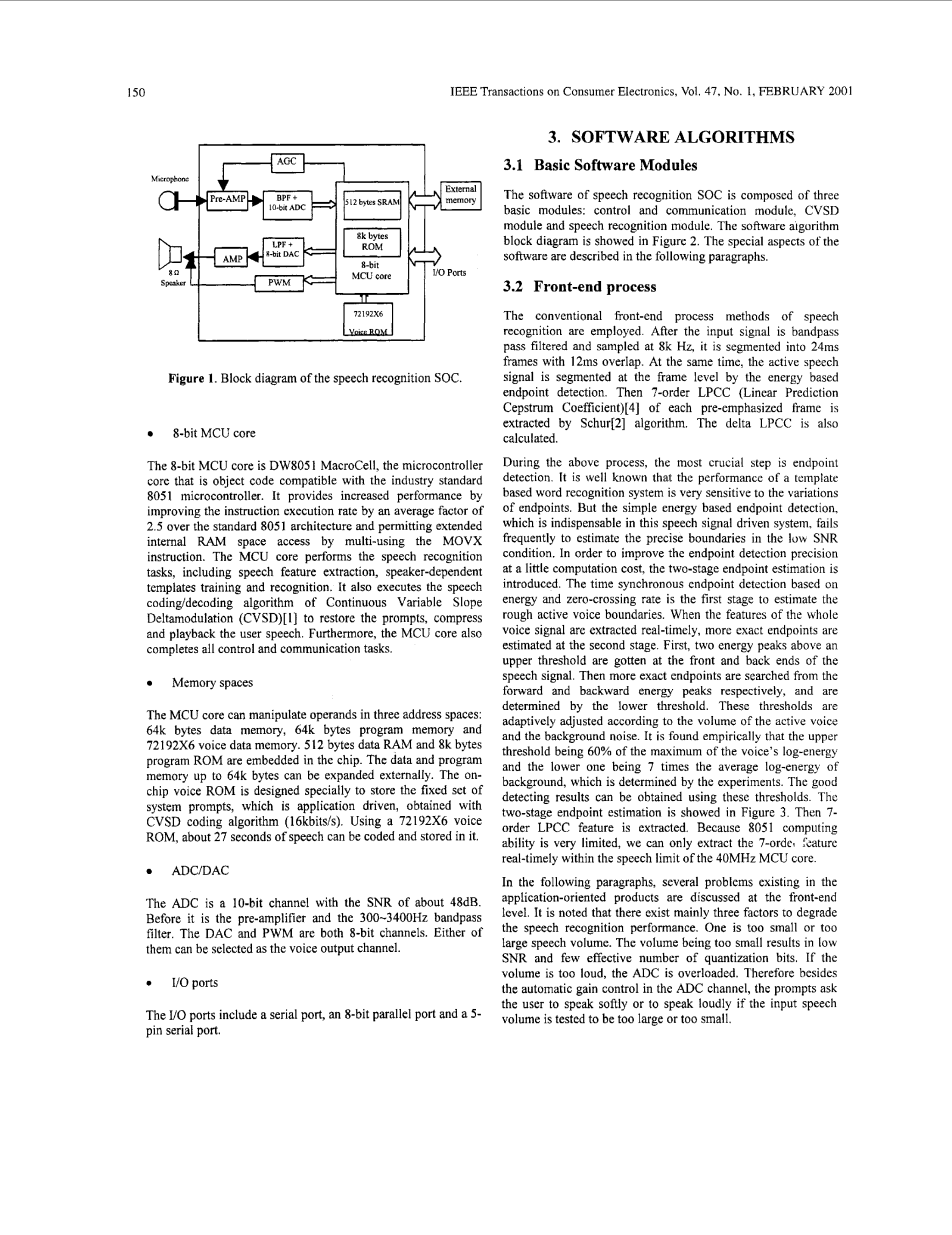 摘要:本文介绍了一种单芯片语音识别系统。它包含提示、语音播放、依赖于扬声器的语音识别等语音功能,适合玩具、游戏、消费电子、办公设备等中的语音激励系统。芯片的设计是基于片上系统芯片(片上系统)。一个8位单片机,随机存储器,只读存储器,数模转换/模数转换,脉宽调制,端口和其它外围电路都嵌入其中。包括控制/通信,语音编码和语音识别算法的软件模块用一个 8051兼容的微控制器核心来实现,从而使芯片的花费成本比较低。语音识别采用模板匹配技术。它每秒识别20个字,在输出输入信噪比超过10db的情况下,识别精度高于95%。语音编码采用连续方程的斜率、增量调制(CVSD)算法。比特率是16kbit/s。