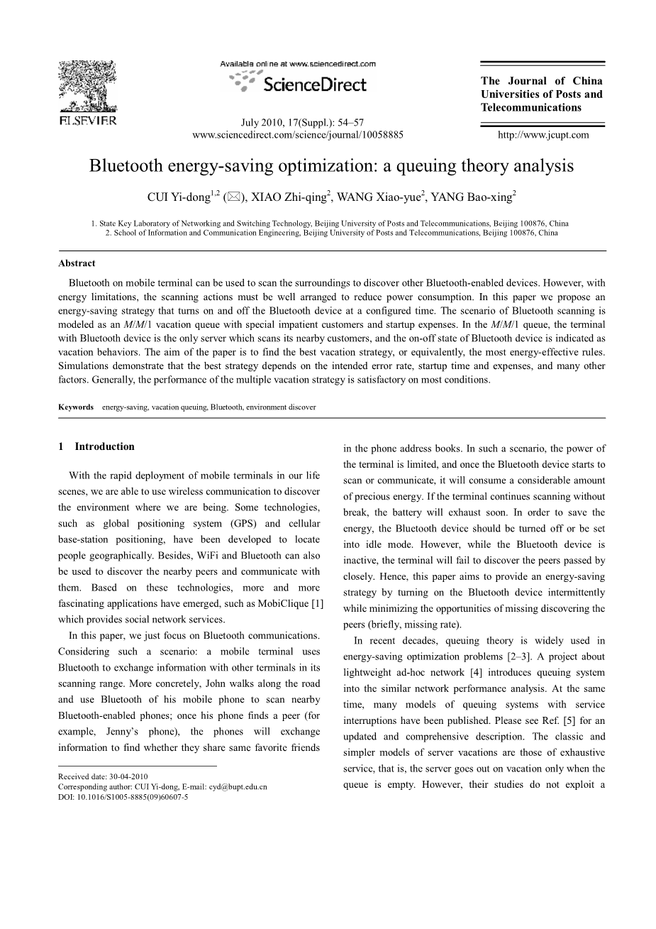 在本文中我们提出了一个关于蓝牙设备应用的节能方案。第一,我们建立了一个有许多特别不耐心的客户的M/M/1队列系统。第二,我们明确了一个比较好的选择:假期方案—触发策略和结束策略。第三,我们提供了一些成熟假期策略的模拟结果然后提及了一个更好的方法来改进假期策略。