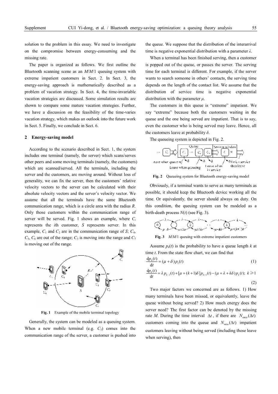 在最近几十年,排队理论被广泛的使用在节能最优化问题中[2-3]。一个关于轻型ad-hoc网络的工程将队列系统引用到相似的网络表现分析。同时,许多拥有服务间隔的队列系统的模型已经推出。请看Ref[5]以便获取最新和理解性的描述。拥有经典并且更为简单的模型服务空闲都是那些有活跃的服务。也就是说,这个服务器只在队列为空的情况下进入空闲。但是,他们的研究没有进一步探索本文中提出的问题。本文的组织结构如下所述。在第二部分我们首先概括蓝牙搜索的场景为一个有不耐烦客户的M/M/1队列系统。在第三部分,节能方法被数学的描述为假期策略的问题。在第四部分,对时间不变假期的方案进行了讨论,一些模拟结果演示与与一些成熟的假期方案进行比较。在第五部分,并且我们进一步对时间变化空闲方案的可行性进行了讨论,并对未来的工作进行了展望。最后,我们在第六部分进行全文的总结。