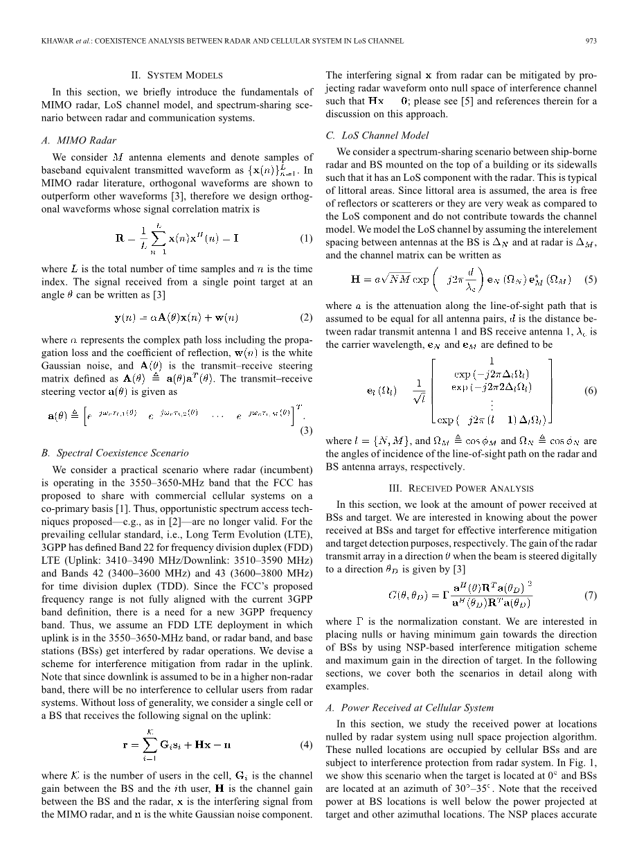 我们考虑一个实际的情况下,雷达 (现有的) 是在 3550-3650-MHz 的频段上运行,FCC 已提出与商业蜂窝系统在 [1]的基础上分享该频段。因此,提出了机会频谱访问技术,如 [2]不再有效。对于现行的蜂窝标准,即长期演进 (LTE),3GPP 已定义频段 22 为频分双工 (FDD) LTE (上行链路: 3410-3490 MHz/下行链路: 3800-3600 MHz) 和42 (3400-3600 MHz) 和 43 (3590-3510 MHz) 用于时分双工 (TDD)。由于 FCC 提出的频率范围与当前 3GPP 频段定义不完全一致,所以需要一个新的 3GPP 频段。因此,我们假设一个 FDD LTE 部署,其中上行链路在 3550-3650-MHz 频段,或雷达频段和基站 (BSs) 受到雷达干扰。在上行链路中,我们设计了一种抑制雷达干扰的方案。请注意,由于下行链路被认为是在一个更高的非雷达频段,将没有干扰从雷达系统的蜂窝用户。在不丧失一般性的情况下,我们考虑在上行链路接收以下信号的单个小区或基站: