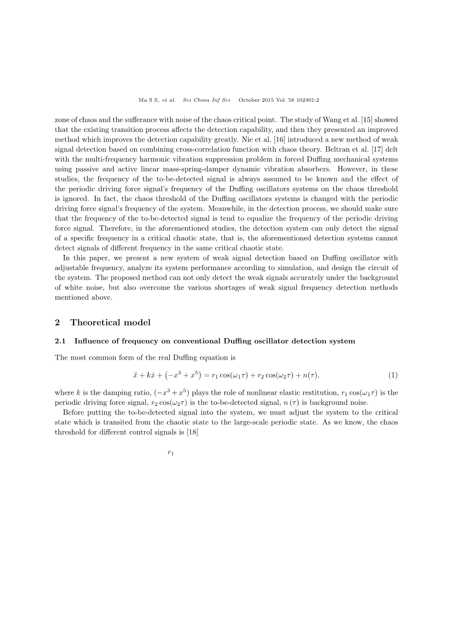 在噪声背景下快速检测信号的出现被广泛应用于许多领域:雷达,声纳和无线通信[1-5]。在这些情况下,弱信号的出现总是突然的。然而,传统的检测方法如功率谱的能力密度(PSD)因为弱信号被埋在噪声中而受到限制[6]。快速傅立叶的方法变换(FFT)可以提高弱信号的检测能力,但频率分辨率很低无法准确判断待检测弱信号的频率[7]。最近几年,使用Duffing振荡器的弱信号检测在信号领域引起广泛的关注,信号检测由于其低检测信噪比(SNR)和对某些周期性信号的灵敏度[8-11]。例如,Rashtchietal[12,13]介绍了一种用于检测状态的新方法-Duffing振荡器,深刻影响其应用的准确性。范等[14]发现达芬振荡器的阈值受混沌相图维持区域的急剧变化能力和混沌临界点噪声的影响。王等人的研究[15]显示现有的过渡过程影响检测能力,然后提出了改进大大提高了检测能力的方法。 Nie等[16]引入了一种新方法基于混合理论的互相关函数的信号检测。 Beltran等[17] delt在强制Duffing机械系统中具有多频谐波抑制问题使用无源和有源线性质量弹簧阻尼器动态吸振器。但是,在这些研究中,被检测信号的频率总是被认为是已知的,影响Duffing振荡器系统的周期性驱动力信号的频率在混沌阈值上被忽略。事实上,Duffing振荡器系统的混沌阈值随着周期性的变化而变化驱动力信号的系统频率。同时,在检测过程中,我们应该确保待检测信号的频率倾向于使周期性驱动的频率相等力信号。因此,在上述研究中,检测系统只能检测信号在特定频率处于临界混沌状态,即上述检测系统不能在相同的临界混沌状态下检测不同频率的信号。