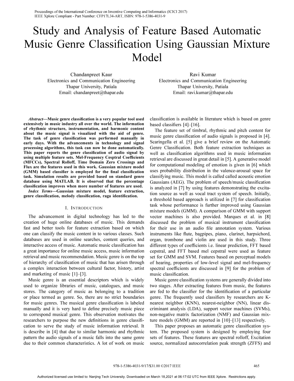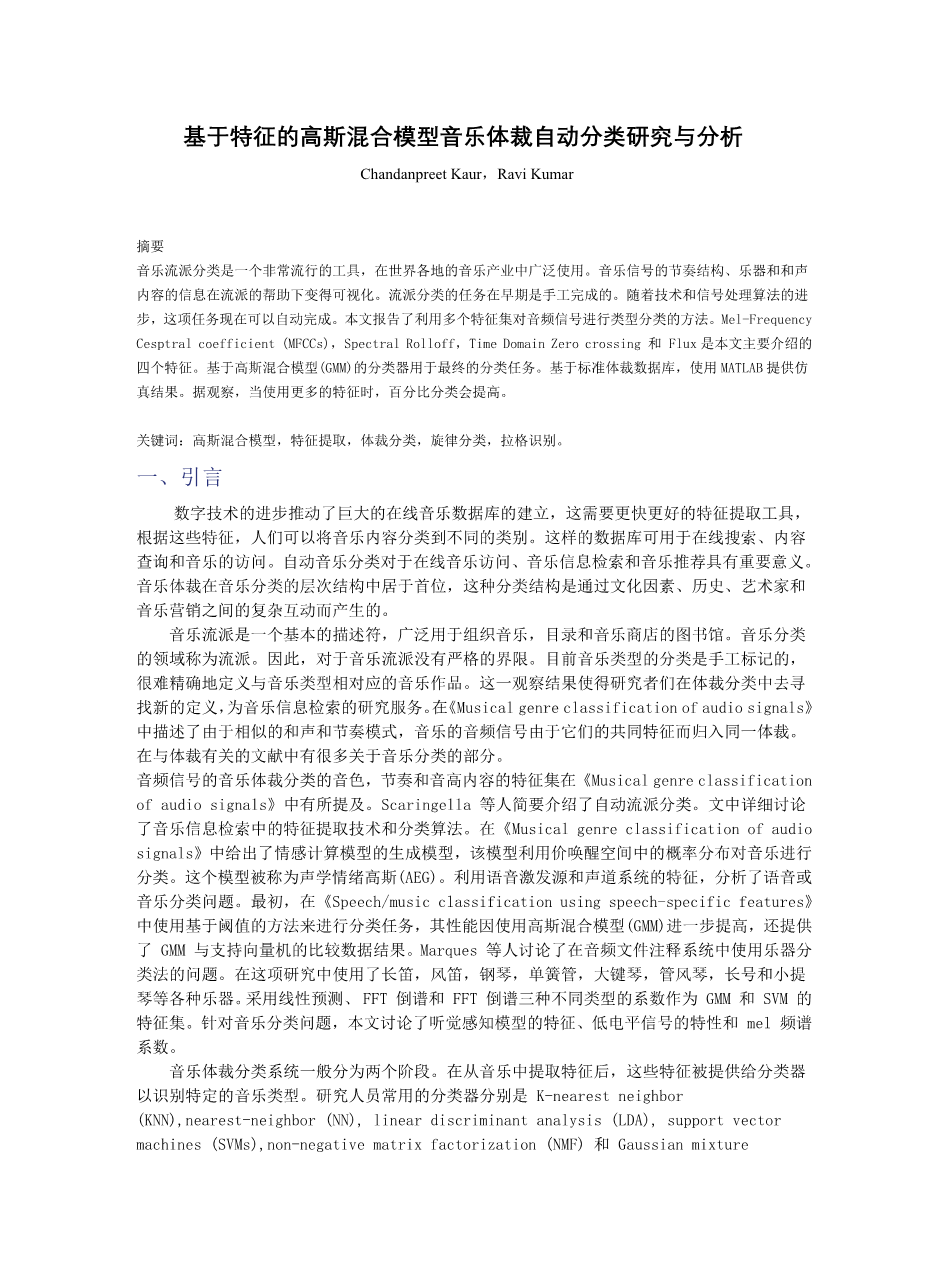 基于特征的高斯混合模型音乐体裁自动分类研究与分析外文翻译资料