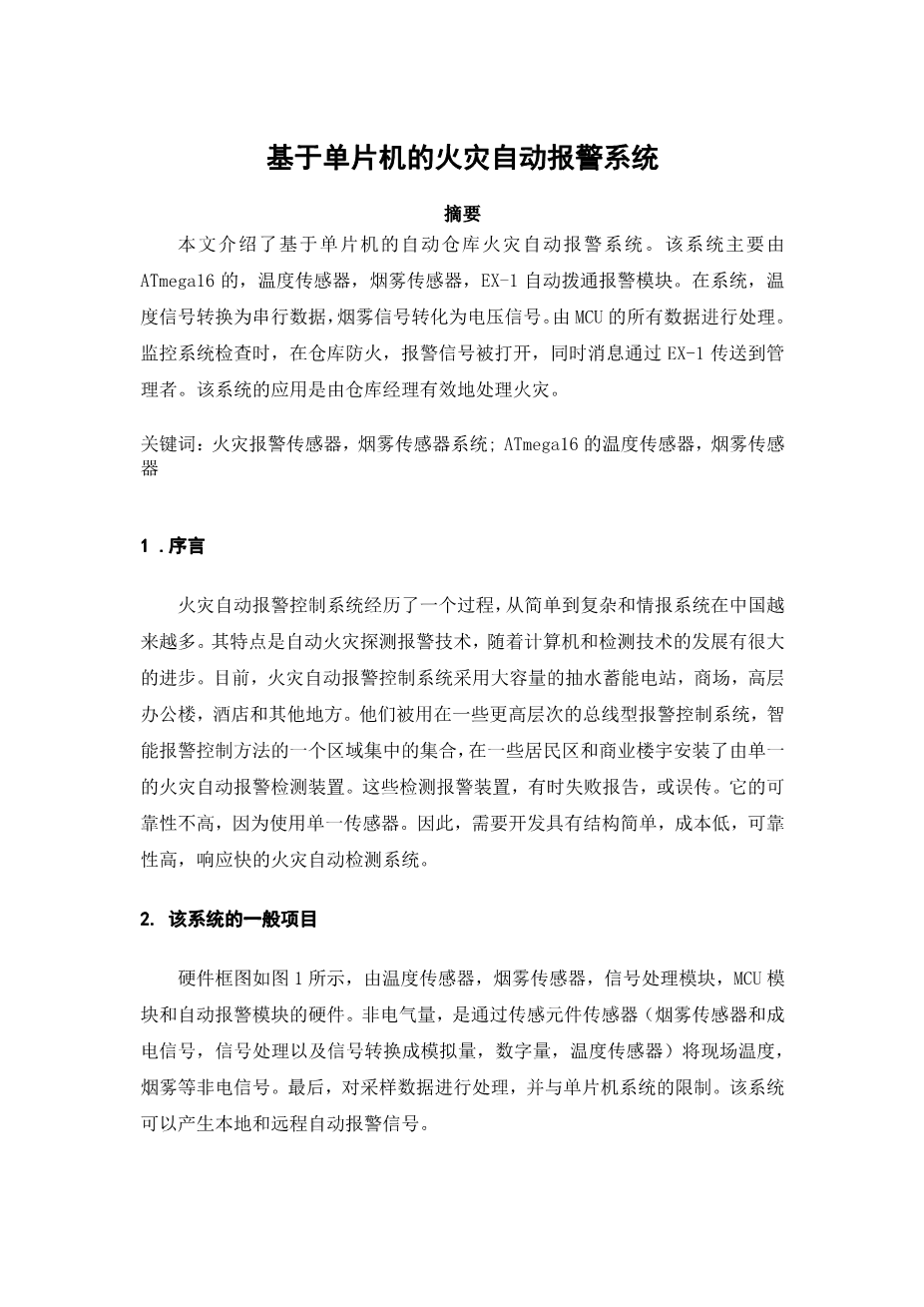 The paper introduced an automatic warehouse fire a1arm system based on MCU. The system was mainly made up of ATmega16, temperature sensors, smoke sensors, and EX-1 auto dialed alarm module. In the system, temperature signals were transformed to serial data, and smoke signals were transformed to voltage signals. All the data were processed by MCU. When the surveillance system checked fire in warehouse, alarm signal was turn on, meanwhile the messages were transmitted to managers through EX-1. Application of the system was convenient to deal with fire in-time, efficiently by warehouse manager.