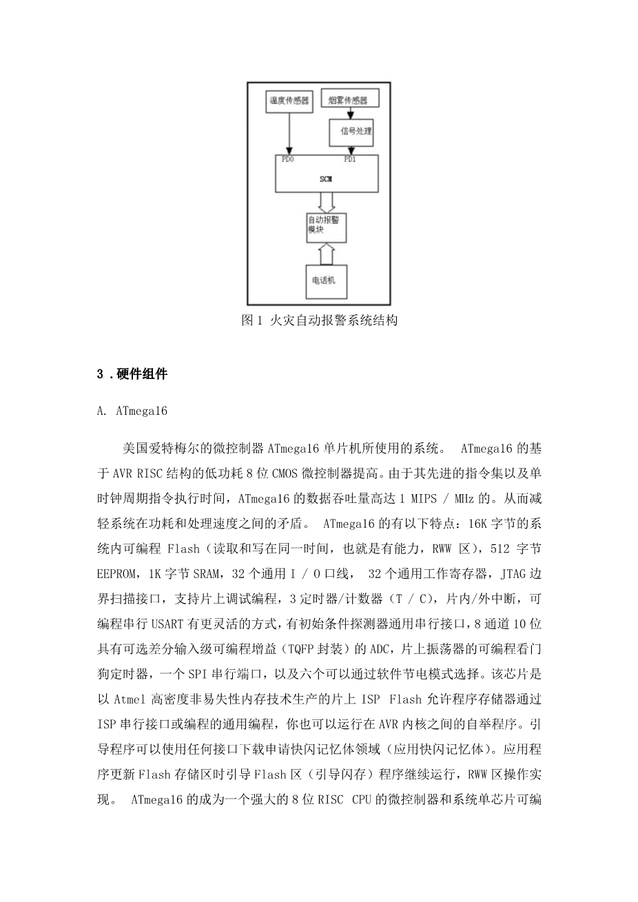 The hardware block diagram shown in Figure 1, hardware by temperature sensors, smoke sensors, signal processing module, MCU modules and automatic alarm module. Non electrical quantity that is through the sensing element sensors (smoke sensors and temperature sensors) will be on-site temperature, smoke and other non-electrical signal into an electrical signal, as well as signals for signal processing to convert analog quantity to digital quantity. Finally, the sampled data were processed and compared with the limits by MCU system. This system can produce local and remote auto-alarm signals.