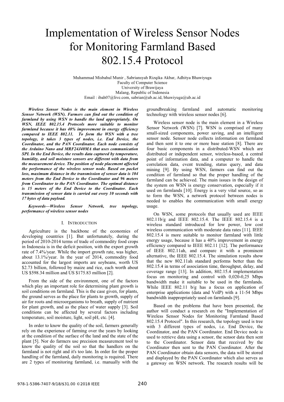 提出了一种智能无线传感器网络,因此作者设计了一种从农业环境中的节点收集数据的架构。他们分析收集的数据,并将结果显示给最终用户。提出了一种基于无线传感器网络的马铃薯种植方法,它可以监控和了解单个作物和需求。因此,农民可以潜在地确定各种肥料、灌溉和其他要求。作者提出了一个灌溉管理模型,利用数学计算和智能湿度传感器来估计农业参数。用于监控的设备是笔记本电脑或PDA。介绍了一种基于无线传感器网络的智能系统,在杨梅温室中使用土壤湿度和温度传感器。该系统可以采集温室的温度、湿度、光照和电压。
