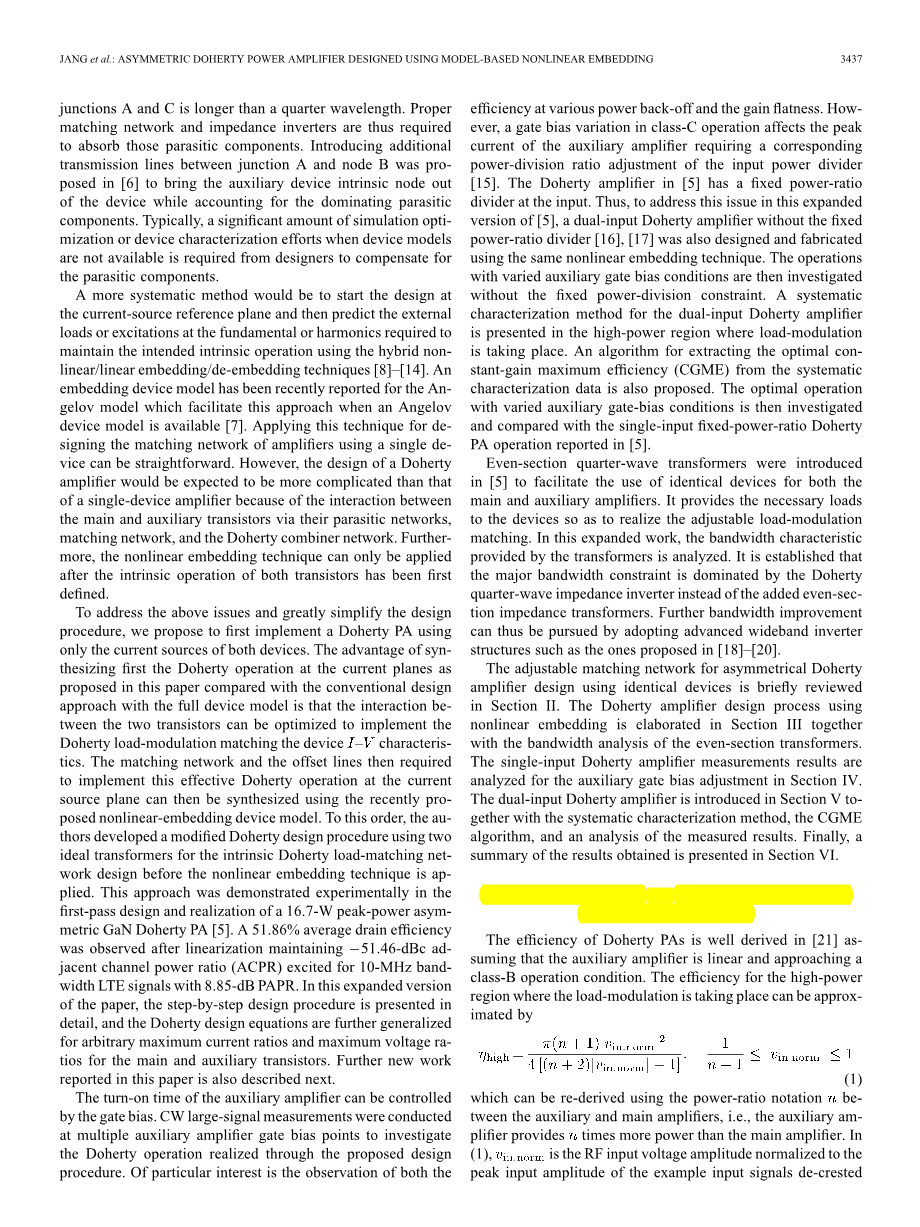 在这个顺序中,作者在应用非线性嵌入技术之前,使用两个理想的变压器开发了一种改进的Doherty设计程序,用于内在的Doherty负载匹配网络设计。这种方法在首次设计和实现16.7W峰值功率不对称GaN Doherty PA [5]中通过实验证明。在线性化之后观察到51.86%的平均漏极效率,保持对于具有8.85dB PAPR的10MHz带宽LTE信号激励的51.46dBc相邻信道功率比(ACPR)。在本文的扩展版本中,详细介绍了逐步设计过程,并针对主晶体管和辅助晶体管的任意最大电流比和最大电压比进一步推广了Doherty设计方程。接下来还将介绍本文中报告的其他新工作。