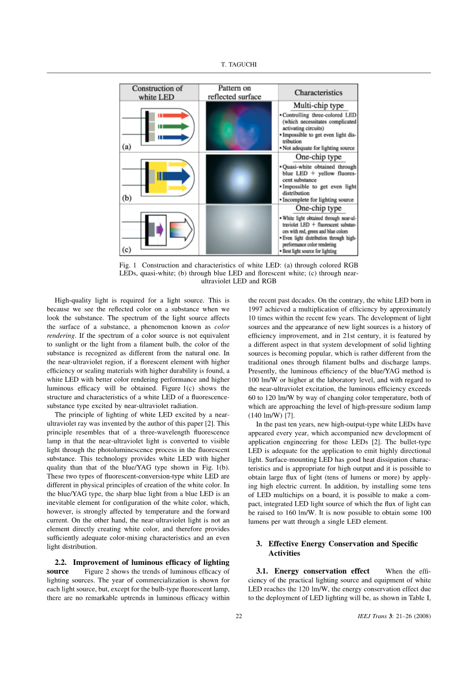 本文作者发明了由近紫外线激发的白光LED照明原理。该原理类似于三波长荧光灯,其原理是近紫外光通过荧光物质中的光致发光过程转换成可见光。该技术提供的白光LED质量高于图2.1(b)所示的蓝/ YAG类型。 这两种类型的白光LED虽然都是荧光材料转换成而成,但是在产生白光的物理原理上是不同的。在蓝色/ YAG类型中,来自蓝色LED的尖锐蓝光是白色配光不可避免的元素,然而,温度和正向电流对配光产生强烈的影响。另一方面,近紫外光不是直接产生白色的元素,因此只能够提供足够的颜色混合特性和均匀的光分布。