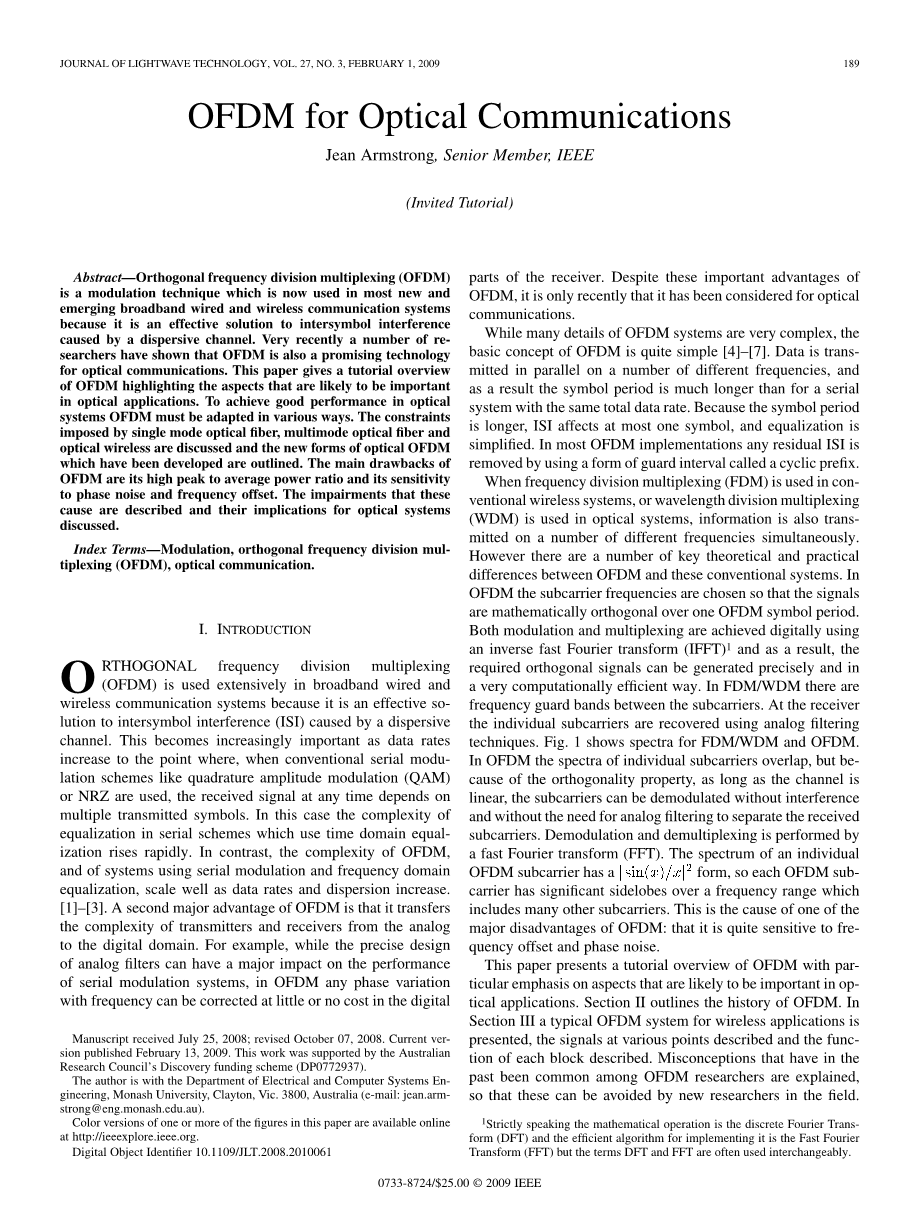正交频分复用(OFDM)是目前最新出现的宽带有线和无线通信系统中使用的一种调制技术,它是一种有效解决信道分散引起码间干扰的方法。最近,许多研究人员已经表明,OFDM也是一种很有前途的光通信技术。本文给出了OFDM的教程概述,重点介绍了在光学应用中可能重要的方面。为了在光学系统中获得良好的性能,OFDM必须以各种方式进行调整。讨论了单模光纤、多模光纤和无线光通信所带来的制约因素,并概述了近年来发展起来的光OFDM的新形式。OFDM的主要缺点是峰均比高,对相位噪声和频率偏移敏感。描述了这些原因造成的损伤及其对光学系统的影响。