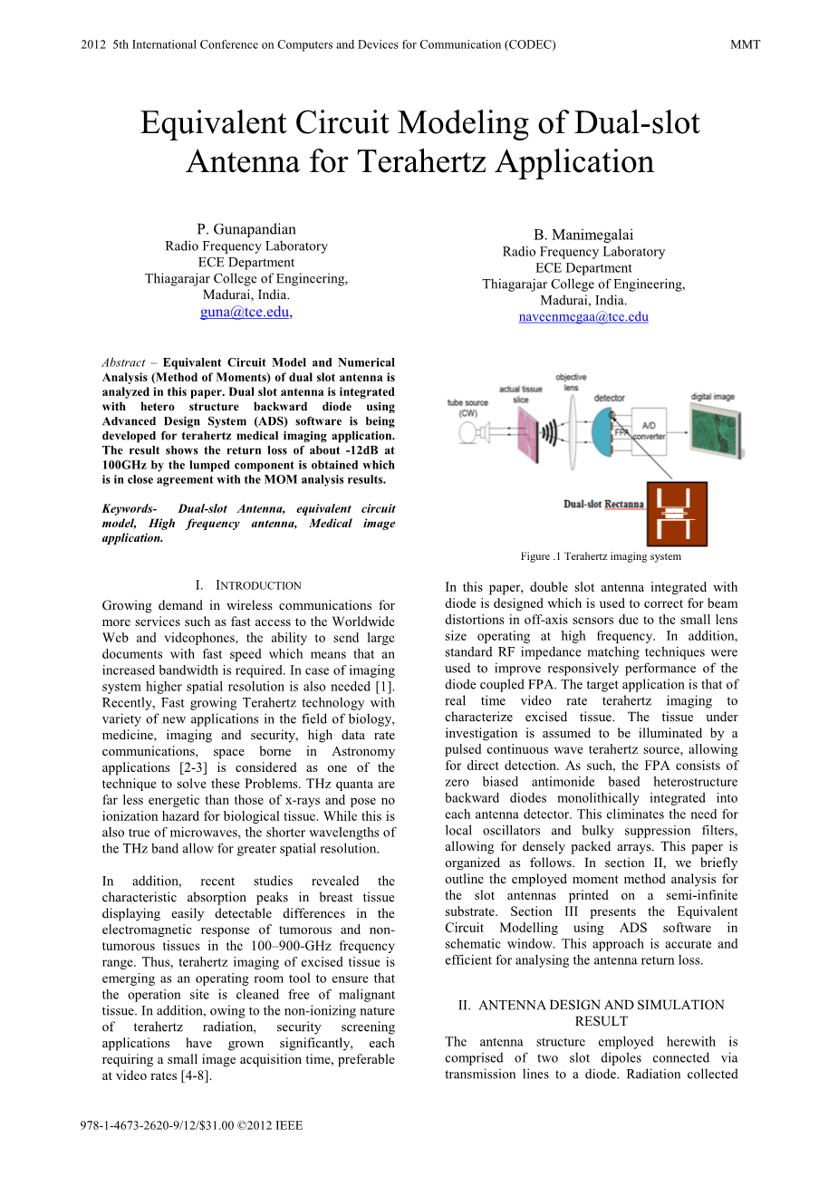 摘要 -本文主要分析等效电路模型和数值双缝隙天线(矩量法)。双缝隙天线集成与异质结构反向二极管用先进设计系统(ADS)软件是为太赫兹医疗成像应用而开发的。结果显示约-12dB的回波损耗100千兆赫的集总元件与MOM分析结果接近。