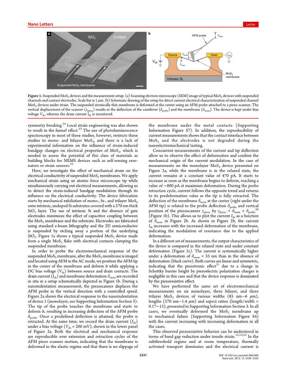 虽然上的拉伸应变和不均匀局部应变下的带隙的应变诱导变形试验的报告已经发表,它们都依赖于光学测量。其他学者报告一个激子红移在约70MeV/%应变为单层二硫化钼的速率,和一个较大速率为双层的二硫化钼。拉曼光谱揭示了应变对振动模式和应变诱导对称性破坏的效果。局部应变工程还显示导致漏斗效应。在大多数这些研究中使用的光致发光光谱,但是,限制了这些研究单和双层二硫化钼,并且对对二硫化钼的电性能应变诱导带隙变化的影响,这是需要的缺乏实验信息评估这类材料作为纳米机电系统设备,如自感应谐振器或应变传感器的潜力。