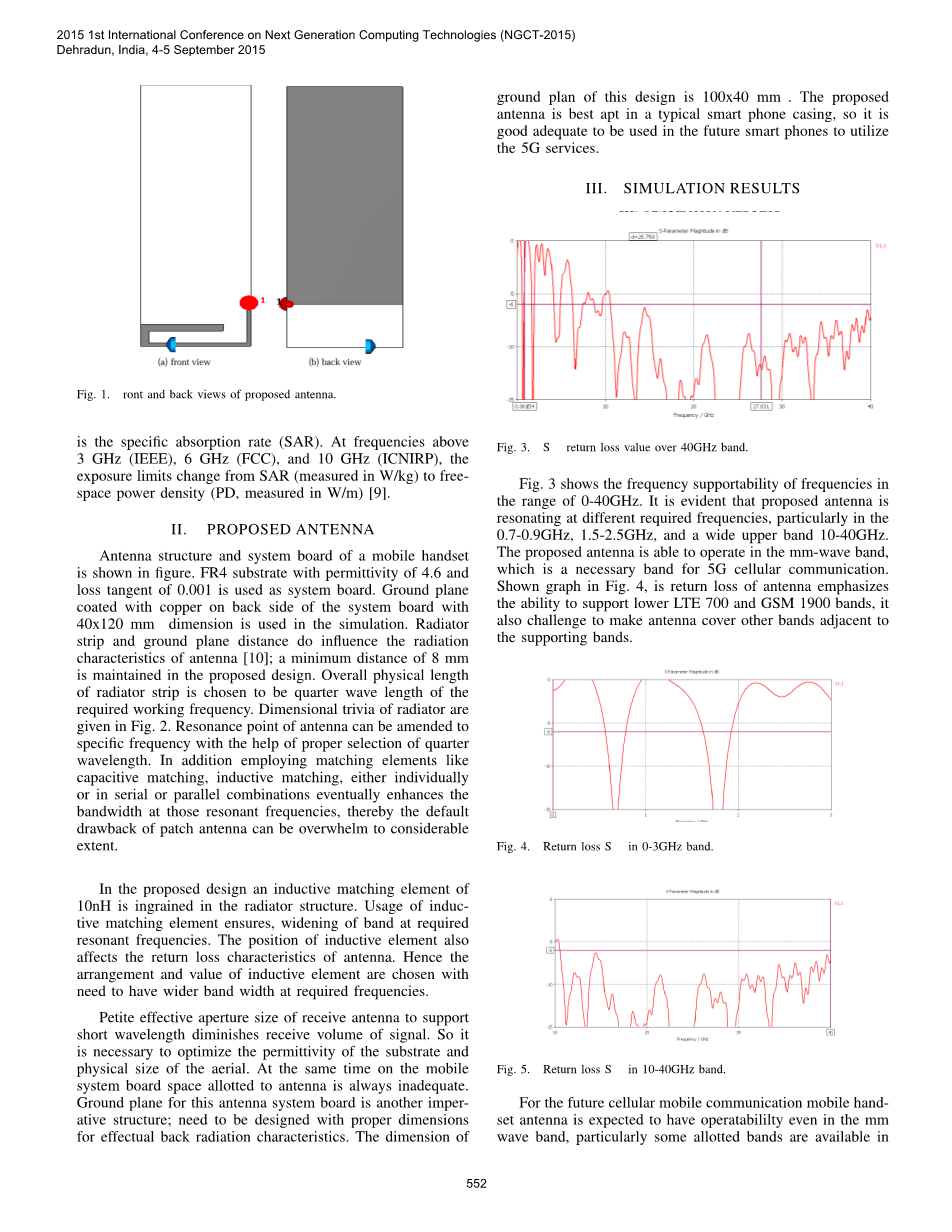 能够支持宽频带是手机天线设计研究中至关重要的一项标准。现如今,多数支持多工作频段的无线网络都将和5G移动通信进行对接,所以,由此看来,使手机天线支持宽频带、多频段是一项必须的设计指标。本文介绍了一款工作于28 GHz的手机天线,它的设计旨在使其能够应用于未来的5G移动通信。本文所述的天线,有三个不同的谐振频段,分别是0.7-0.9 GHz, 1.5-2.5 GHz, 以及超宽频带10-40 GHz,相应的在28 GHz、2.2 GHz和1.5 GHz处,分别获得了8.7 dBi、5.8 dBi和5.2 dBi的增益,表现出此天线应用于未来5G手机通信的可行性,尽管测试结果如此,但是更高的增益更是我们需要的。另外,如何在高频率处仍可保持可接受的天线尺寸,也是本文的工作重点。