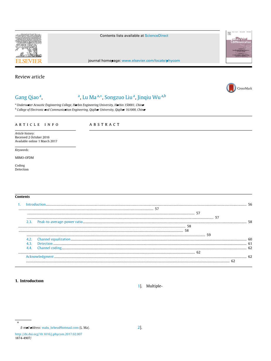 水声通信; MIMO-OFDM 系统;信道估计;编码;检测