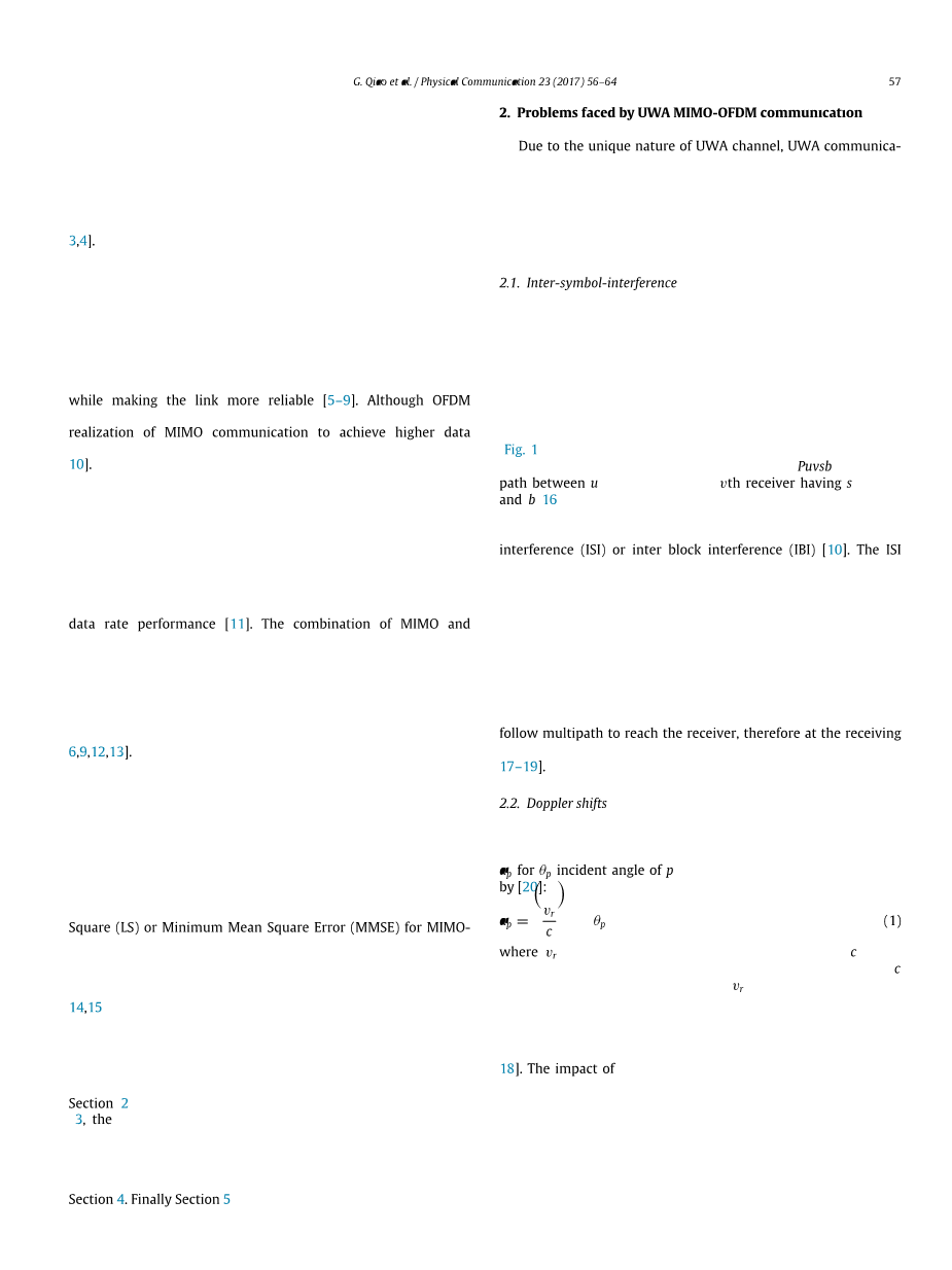 当 vr 表示发射机/接收器速度和 c 是声速在水中。在无线通信中, 波的速度 c 相对于 vr 来说太大, 这使得多普勒尺度因子几乎可以忽略不计, 而在水中声速较慢的结果是更大的多普勒尺度因子。水声OFDM系统中的多普勒频偏移在不同的子载波 (即 non-uniform 多普勒位移) 中有很大的不同, 导致严重的跨载波干扰 (ICI) [18]。通过保持副载波频率间距大于可能的频率偏差, 可以减小多普勒频移的影响,这明显地导致光谱效率和数据速率的退化。在OFDM通信系统中, 研究者提出的缓解这一问题的两个重要而简单的方法是: 使用空载波进行相位同步, 并使用考虑连续OFDM块之间的相位一致性的自适应方法。在MIMO的情况下, 多普勒位移的补偿是相当重要的问题, 因为接收器的所有到达信号可能没有相同的多普勒尺度因子;不同的频道可以有不同的值。此外, 在多用户或分布式MIMO系统中, 多普勒尺度因子对于不同的用户是完全不同的, 因为用户可能会在不同的方向上移动, 如图2所示的接收机[21、22]。