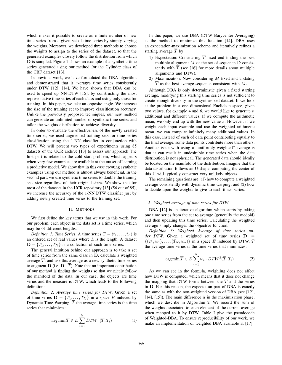 在先前的工作中,我们制定了DBA算法,并证明了它在DTW [12],[14]下一致地对时间序列进行平均。我们已经证明,通过构造每个班级中最具代表性的时间序列并且仅 将其用于训练,DBA可用于加快NN-DTW [15]。在本文中, 我们采取相反的角度。我们增加训练集的大小以提高分类 准确性。与以前提出的技术不同,我们的新方法可以生成 无限数量的合成时间序列,并调整权重分布以实现多样性。
