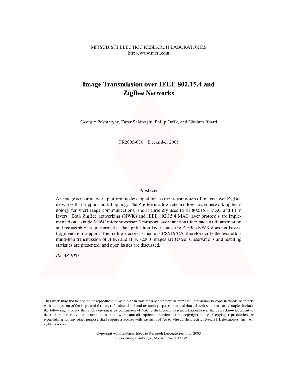 虽然联盟的既定目标不是支持通过网络传输图像,但它显然是一种理想的功能,尤其对于监控系统而言。此外,随着ZigBee标准的发行,预计会出现这种情况兼容的收发器将变得容易获得。本文探讨了ZigBee网络在图像传输中的应用。本文的结构如下:第二部分简要概述了ZigBee的主要特性。第三节讨论了ZigBee网络上图像传输的一些特定问题。第四节描述了一个在MERL上构建的实验系统,用于测试ZigBee网络上的应用程序以及支持图像传输所需的修改。第五节讨论了图像传输测试的结果,并报告了诸如延迟和吞吐量等性能指标。我们在文章中总结了对ZigBee标准未来版本的观察和建议。