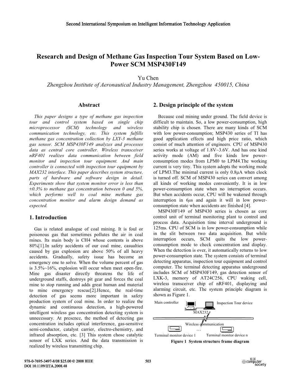 本文设计一种基于单片机和无线通信等技术的煤气监测和控制系统。该系统通过LXY-3煤气传感器实现煤气浓度采集。单片机MSP430F149作为核心控制器分析和处理数据。无线收发器nRF401实现现场监控和检测设备之间的数据通信。并且主要的控制器通过MAX232接口与检测设备连接。本文详细地描述了系统结构,硬件和软件设计部分的内容。实验表明,在煤气浓度为0~5%时系统监控误差小于plusmn;0.3%,煤气浓度监测和报警设计按预期要求。