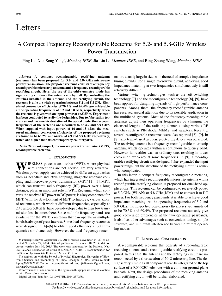 关键词:紧凑型微波功率传输(MPT),可重构整流天线。