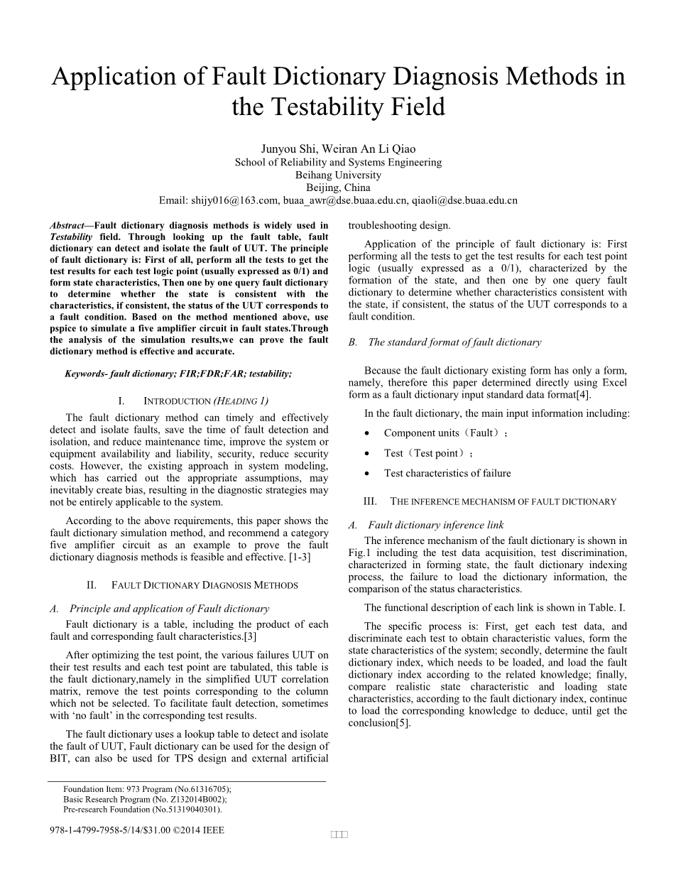 故障字典诊断方法被广泛应用于测试领域。通过查阅故障表格,故障字典可以检测和隔离被测装置的故障。故障字典的原理如下:首先,执行所有测试去获得每一种逻辑测试点(通常是0或1)的测试结果,并组成状态特征;然后一个接着一个查询故障字典去判定当前的状态是否和某一种特征一致,如果一致的话,被测芯片的情况符合一种错误类型。基于上文所述的方法,在故障状态下,基于PSPICE(计算机辅助电路设计程序)去仿真一个五运放的电路。通过分析仿真结果我们可以证明故障字典方法是有效的和精确的。