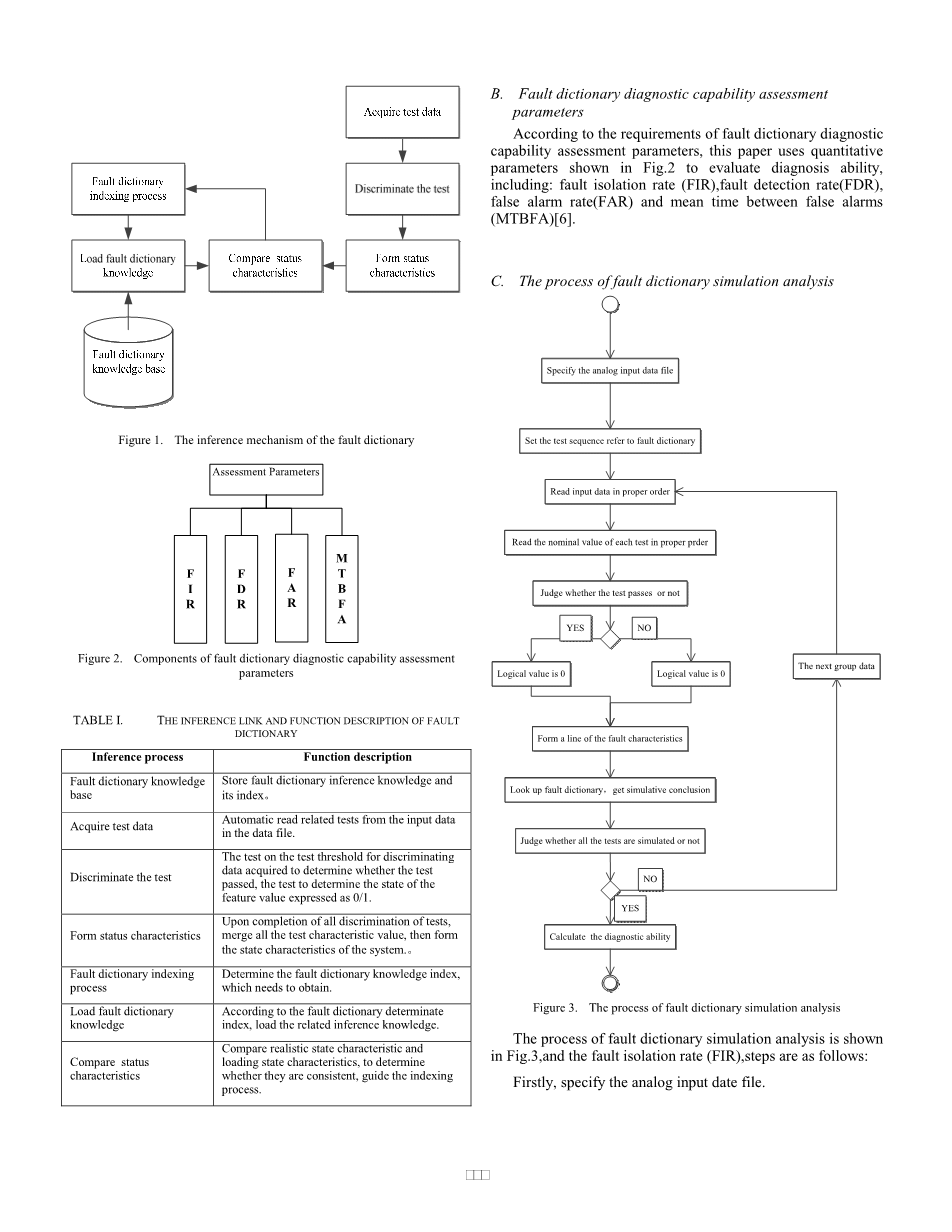 故障字典使用一个可以查询的表格去检测和隔离待测芯片的故障,故障字典已经被应用于BIT的设计,也被应用于TPS设计和外部人工检修设备。