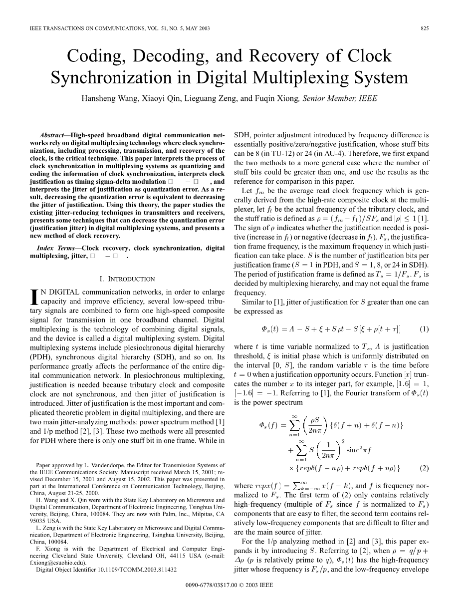 高速宽带数字通信网络依赖于数字多路复用技术。其中,时钟同步技术,包括处理,传输,以及时钟恢复,都是很关键的技术。本文阐述了在多路复用系统中,时钟同步就是量化同步时钟信息和编码同步时钟信息的过程,解释了时钟码速调整是定时Sigma;-Delta;调制的过程(),同时还解释了码速调整的抖动作为量化误差。其结果是,降低了量化误差等同于降低了码速调整的抖动。利用这一理论,本文研究了现有的在发射器和接收器中的抖动减少技术,并提供了一些技术,可以减少数字复接系统中的量化误差(码速调整的抖动),提供了一个新的时钟恢复的方法。