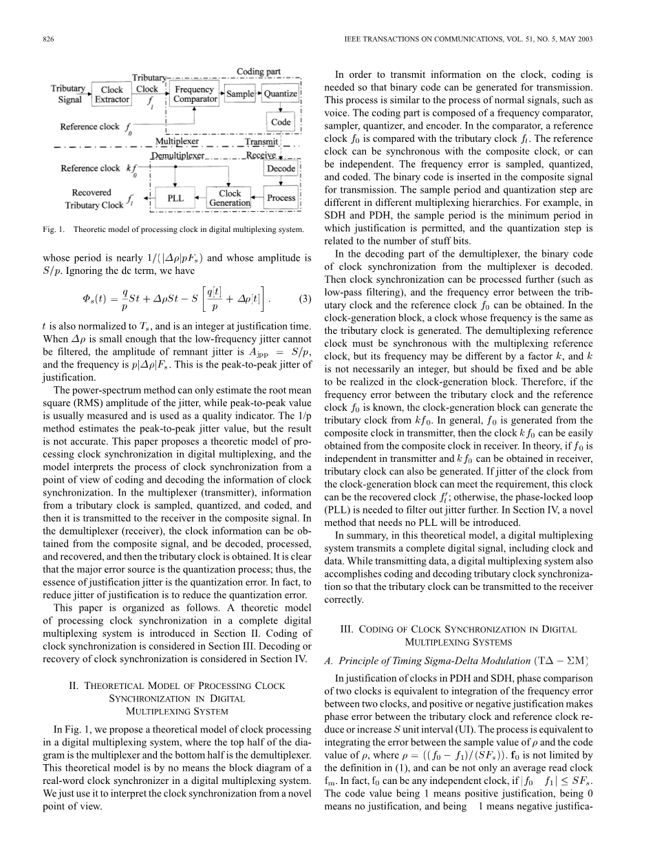 为了传输的时钟信息,编码是很有必要的,这样就可以在传输中产生二进制代码。这个过程类似于正常信号的进程,如语音信号。编码部分由频率比较器,采样器,量化器和编码器组成。在比较器中,参考时钟fo与支路时钟fl进行比较。参考时钟可以是与合路时钟同步的,也可以是独立的。将频率误差进行采样、量化和编码。二进制码被插入到复合信号中用于传输。采样周期和量化步长在不同的复用层次是不同的。例如,在同步复接体系和准同步复接体系中,采样周期是允许码速调整的最小周期,而且量化步骤与填充位的步骤相关。在解复用器的解码部分,来自于多路复用器的二进制位同步时钟被解码。然后同步时钟可以进一步被加工(如低通滤波),而且可以得到支路时钟和参考时钟之间的频率误差。在时钟发生模块里,可以生成一个与支路时钟频率相同的时钟。解复用的参考时钟必须与复用信号参考时钟同步,但它的频率很可能因为某些因素而不同,虽然不一定要求是整数,但应该是可以被固定并能够由时钟块来发生。因此,如果支路时钟和参考时钟fo之间的频率误差是已知的,时钟发生块可以生成就可以根据生成支路时钟。在一般情况下,fo是从发射端得复合时钟中生成的,则时钟可以很容易地从接收端的复合时钟中得到。在理论上,如果fo独立于发射端,并且可以在接收器中获得,就也可以产生支路时钟。如果从时钟发生块中产生的时钟抖动能够满足要求,那么这个时钟就可以是所恢复的时钟fl;否则,锁相环(PLL)是需要进一步筛选出抖动。在第四节,一种新型的方法将不需要使用锁相环。总之,在此理论模型中,数字复接系统发送一个完整的数字信号,包括时钟数据。当发送数据时,数字复接系统也完成编码和解码支路同步时钟,使得支路时钟可以被正确的发送到接收端。
