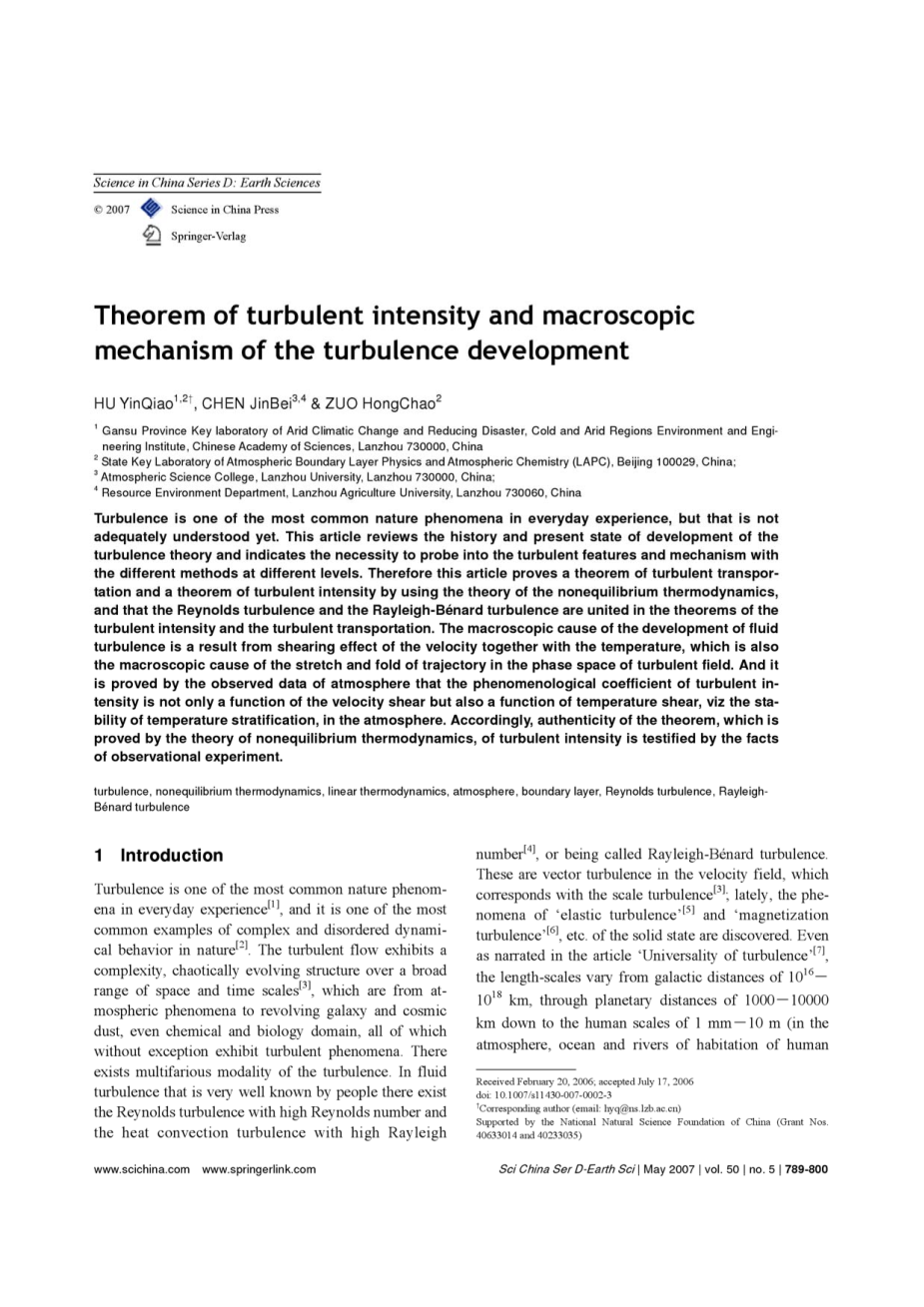 湍流是在日常经验中最常见的大自然的现象之一,但是尚未被充分了解。本文回顾了湍流理论发展的历史和现状,并指出有必要探讨在不同的层次湍流功能和机制的不同的方法。因此,这篇文章证明湍流运输和湍流强度使用的定理是非平衡热力学理论定理,而雷诺湍流和瑞利 - 贝纳德漩涡湍流组成湍流强度和湍流输送的定理。流体湍流发展的宏观原因是从与温度,这也是在湍流区的相位空间的伸展和轨迹的折叠的宏观原因剪切速度的共同作用的结果。在大气中,它是由大气的观测数据证明了湍流强度的现象系数不仅是速度剪切功能,也是温度剪切的功能,即温度分层的稳定性。因此,该理论的真实性是由非平衡热力学理论证明的,湍流强度是通过观察实验的事实被证明的。