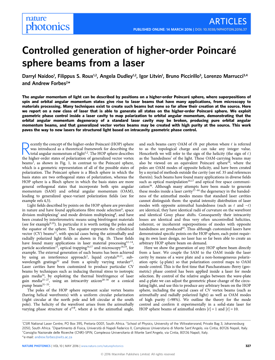 光的角动量可以用高阶庞加莱球体上的位置来描述,旋转和轨道角动量状态产生了从显微镜到多种应用的激光束材料加工创建这样的光束有许多技术,但是迄今为止还没有一种技术允许它们在源头上产生,这里我们报告了一种能够在高阶庞加莱球体上产生所有状态的新型激光。我们利用激光腔内的几何相位控制将极化映射到轨道角动量,表明标准激光腔的轨道角动量简并可能被破坏,产生纯轨道角动量梁,并且可以在激光光源处以高纯度创建广义矢量涡流束。这个工作基于腔内几何相位控制的结构化光为新激光器铺平了道路。