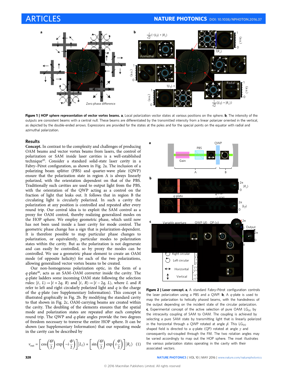 我们的非均匀偏振光学元件,形式为aq板用作腔内的SAM-OAM转换器。 的q-plate在选择后会先入一些进入的OAM状态规则:| ℓ,Lgt;→| ℓ 2q,Rgt;和| ℓ,Rgt;→| ℓ-2q,Lgt;,其中L和R指的是左,右圆偏振光,q是电荷(见补充信息)。 这个概念是如图所示。 2b。 通过修改标准腔如图1所示。 如图2c所示,在其中创建携带OAM的波束空腔。 元素的倍增确保了空间模式和极化状态在每次完成后重复往返。 QWP和q-plate角度提供两度需要穿越整个HOP球体的自由度。 有可能显示(参见补充信息)我们的重复模式在腔中可以描述为: