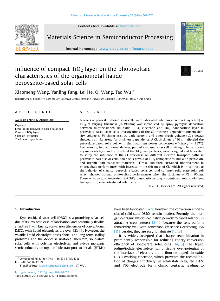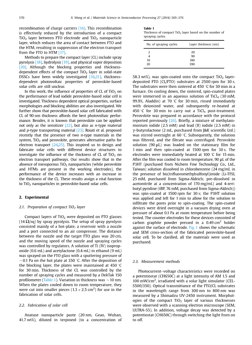 制备致密层的方法包括喷雾热解法,水解法,物理烟雾沉积法。尽管固态DSSC中TiO2致密层的阻挡性能和厚度影响已经被广泛的研究,厚度影响的钙钛矿太阳能电池光电性能仍然不是很清楚。