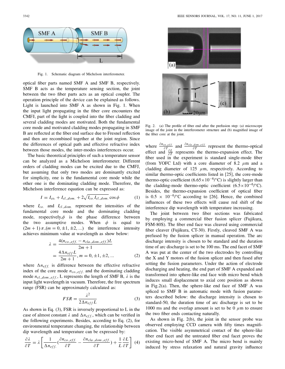 光纤传感器与传统传感器相比,具有经济、适用、紧凑、隔离电磁等诸多优点,在传感器发展过程中已成为不可缺少的组成部分。在这些光纤传感器中,高温传感器由于在石油勘探、工业生产和其他恶劣环境的温度监测中发挥着巨大的作用而日益引起人们的研究兴趣。多种类型的光纤传感器被用于高温传感,特别是基于新型光纤结构[1]-[11]和特殊光纤[12]-[20]的多模干涉仪。用于温度传感的基本多模干涉仪包括马赫-曾德尔干涉仪(MZI)[1]-[5]、迈克尔逊干涉仪(MI)[6][7]、法布里-珀罗干涉仪(FPI)[8]、[9]和萨格纳克光纤环[10]、[11]。例如,甄银等人用CO2激光器制成了V型槽的马赫-曾德尔干涉仪,将温度从50℃提高到550℃,在500℃下其温度灵敏度最高为114.65pm/℃, [2]。袁等人[7],介绍了用飞秒激光制作的全光纤干涉式温度传感器,在接近1000℃时其灵敏度为14.72pm/℃ [10]。Shi等人研制了基于萨格纳克环的光纤激光温度传感器,在30℃~40℃范围内获得了1.739nm/°C的温度灵敏度。然而,上述干涉仪结构或多或少会遇到一些制造复杂 [1]-[3]、[7]、低温灵敏度[4]、[5]和温度范围窄[10]、[11]的问题。此外,包括多芯光纤[12]、[13]、光子晶体光纤(PCF)[14]、[15]和其他类型的光纤[16]-[20]在内的特殊光纤也被广泛地用于高温传感。最近,邓等人[12]展示了一种高达900℃的高温传感器,采用多芯光纤制成其灵敏度为165pm/°C。Nguyen等人[17]提出了一种基于悬芯光纤的高温传感器,最高温度可达1100℃。然而,与普通光纤(包括单模光纤和多模光纤)相比,特种光纤价格昂贵,成为其广泛应用的阻碍。此外,对于纤芯失配干涉仪传感器,近年来已有许多研究报道,其中一些是基于不同纤芯直径的拼接光纤[21]、[22]。另一些是基于使用熔接器的手动模式[23]、[24]在纤芯之间具有一定偏移量的熔接光纤。据我们所知,前者已用于高温传感[19],而后者的高温响应尚未被研究。
