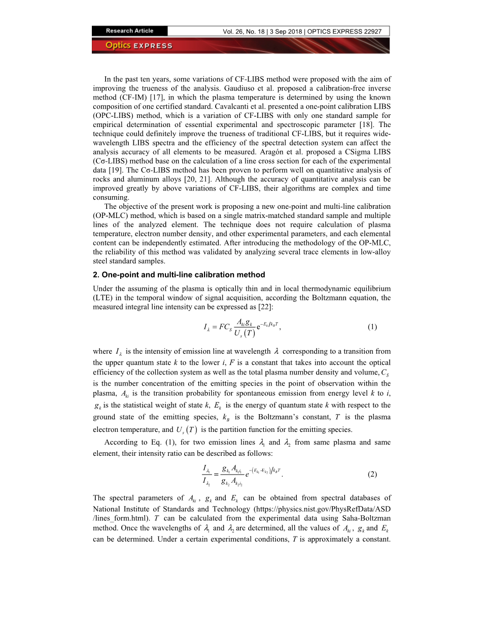 在过去的十年中,提出了一些CF-LIBS方法的变化,以期为目标提高分析的真实性。 Gaudiuso等人提出了无校准逆方法(CF-IM)[17],其中通过使用已知的方法确定等离子体温度一个认证标准的组成。 Cavalcanti等人。提出了一点校准LIBS(OPC-LIBS)方法,它是CF-LIBS的变体,只有一个标准样品经验确定必要的实验和光谱参数[18]。该技术肯定可以提高传统CF-LIBS的真实性,但它需要宽波长LIBS光谱和光谱检测系统的效率可以影响分析所有待测元素的准确度。阿拉贡等人。提出了一个CSigma LIBS(Csigma;-LIBS)方法基于每个实验的线截面的计算数据[19]。已证明Csigma;-LIBS方法在定量分析方面表现良好岩石和铝合金[20,21]。尽管定量分析的准确性可以通过CF-LIBS的上述变化大大改善,但是它们的算法复杂和消耗时间长。