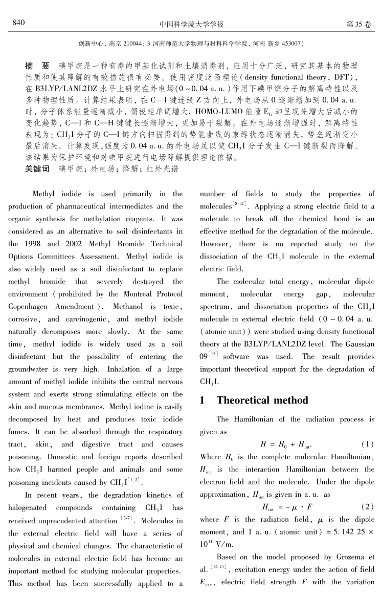 利用高斯09软件和B3LYP / LANL2DZ方法研究CH3I分子在外电场(0-0. 04a.u.(原子单位))下的分子键长度, 分子总能量, 分子偶极矩, 分子能隙, 分子谱和解离性质[13]. 研究结果为CH3I及其降解研究提供了重要的理论参考.