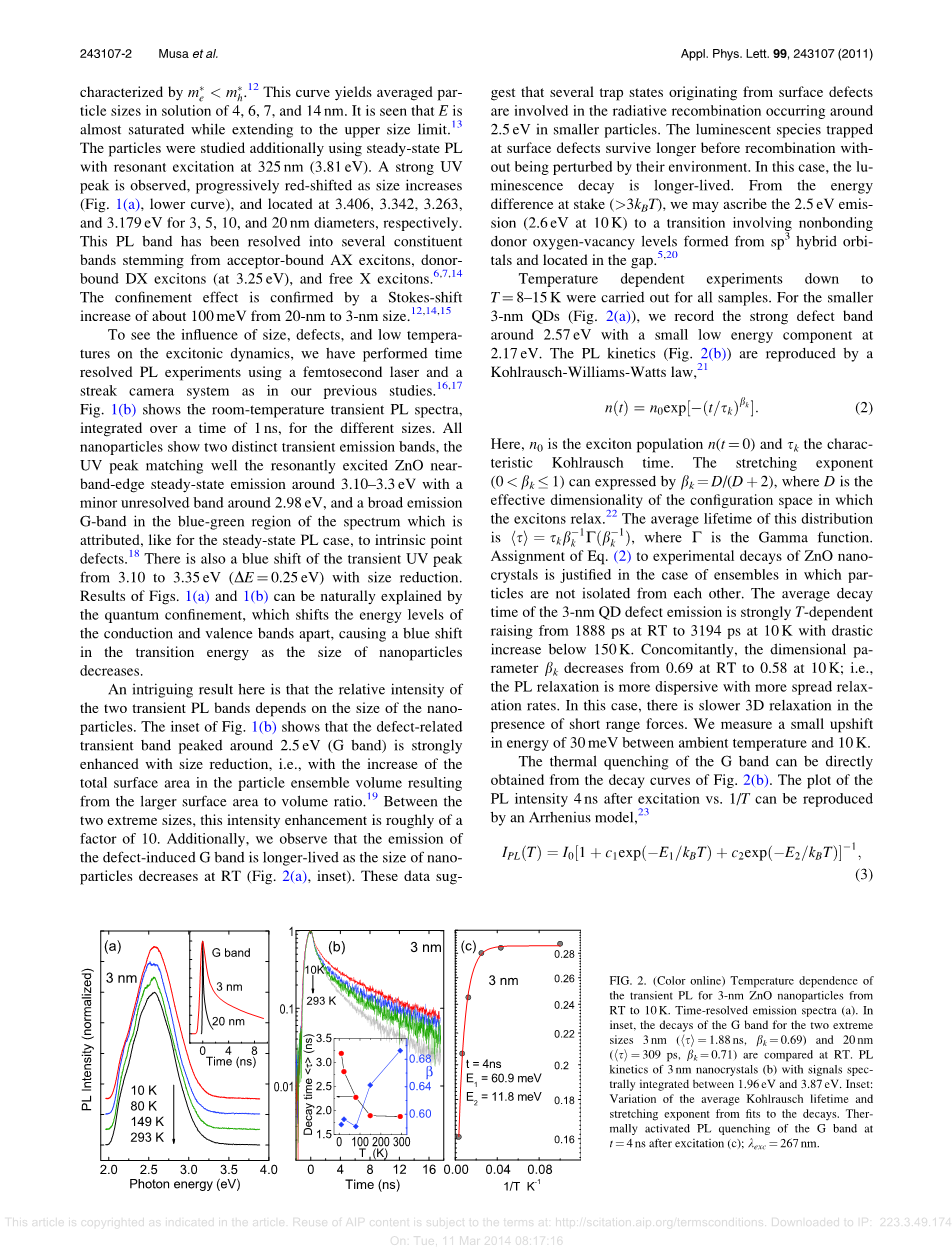 这里的一个有趣的结果是,两个瞬态PL频带的相对强度取决于纳米粒子的尺寸大小。随着由更大的表面积与体积比率所导致的颗粒集合体积中的总表面积的增加,图1的插图。 图1(b)表示在2.5eV(G带)附近峰值的缺陷关联的瞬态带在尺寸减小时强烈增强。在两种极端尺寸之间,这种强度增强大致为10倍。此外,我们观察到缺陷诱导的G带的发射更长,因为在RT下纳米颗粒的尺寸减小(图2(a) ,插图)。这些数据表明,几个陷阱态起源于发生在约2.5 eV的小颗粒的表面缺陷参与的辐射复合。被困在表面缺陷的发光物质在重组之前存活更长时间,而不被其环境干扰,在这种情况下,发光衰减寿命更长。 从所关注的能量差(gt; 3kBT),我们可以将2.5eV发射(在10K下2.6eV)归因于涉及由sp混合轨道形成并位于间隙中的非结合供体氧空位水平的跃迁。对所有样品进行温度依赖性实验从T= 8–15k,对于较小的3 nm量子点(图2(a)),我们记录了2.57 eV左右的强缺陷带,在2.17 eV具有小的低能量分量。光致发光动力学(图2(b))是由一个可用威廉姆斯瓦法复制再现。